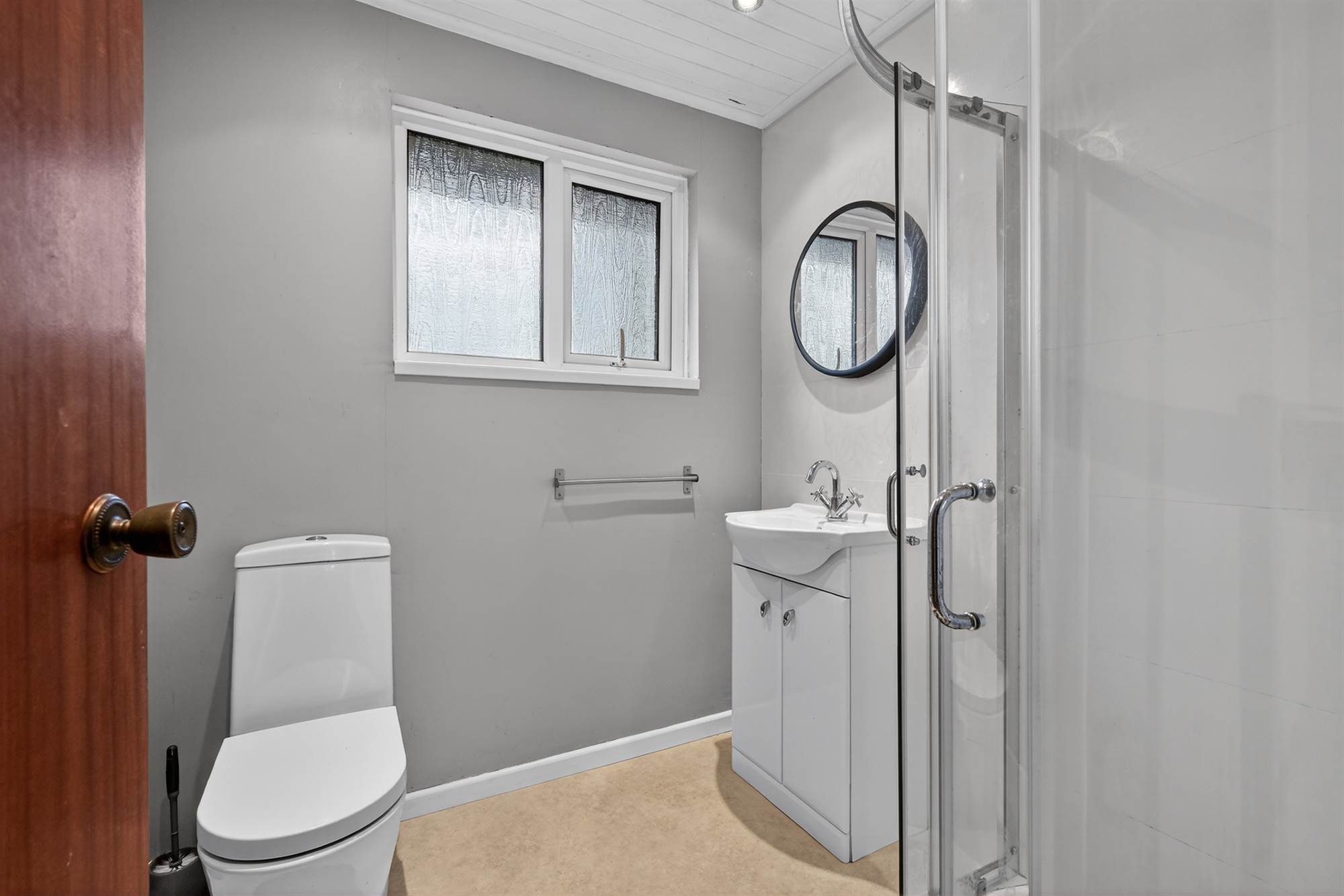 White suite comprising low flush wc, vanity unit with chrome mixer tap and built-in cabinet below, built-in shower cubicle with Mira Sport electric shower unit, ceramic tiled splashback, tongue and groove ceiling, low voltage spotlights, heated towel rail, access to roofspace via Slingsby ladder, (not floored but with light).