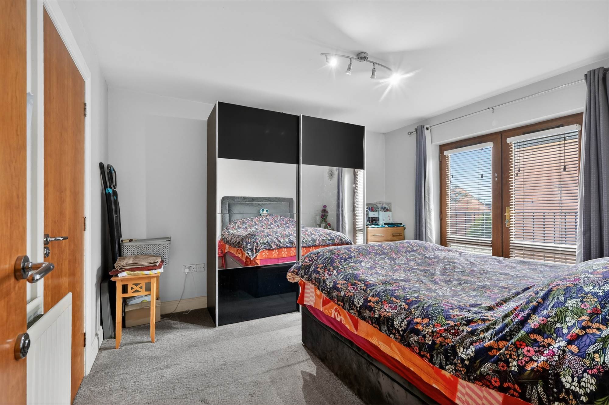 Carpeted, double doors onto Juliette balcony.