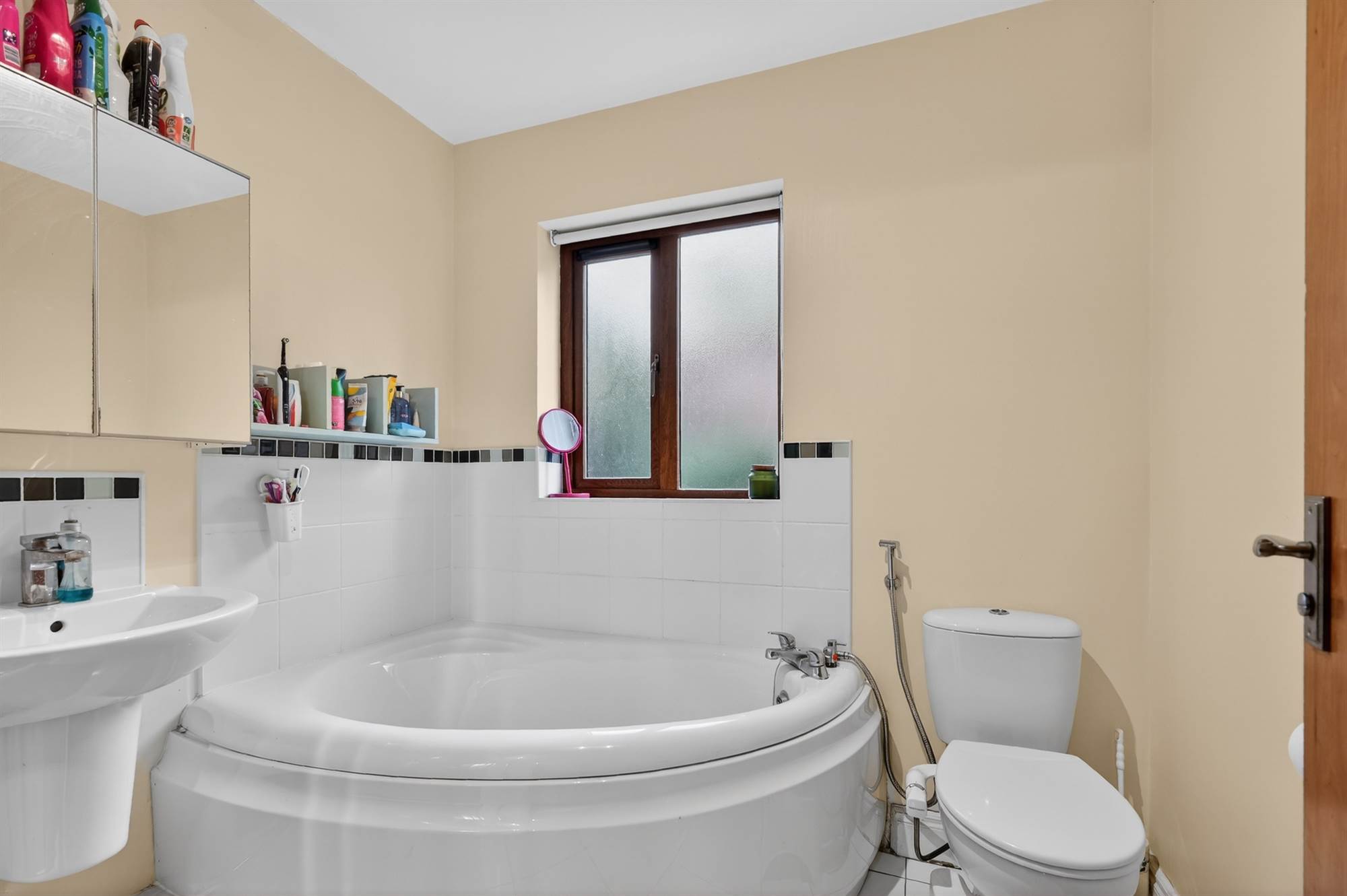 Low flush wc, wall hung wash hand basin, corner bath, walk-in shower cubicle, tiled flooring, part tiled walls, extractor fan.