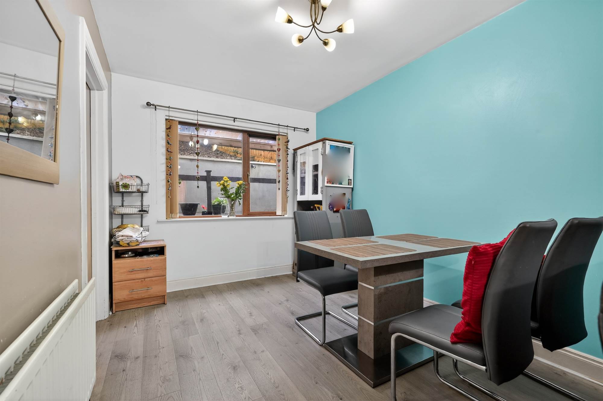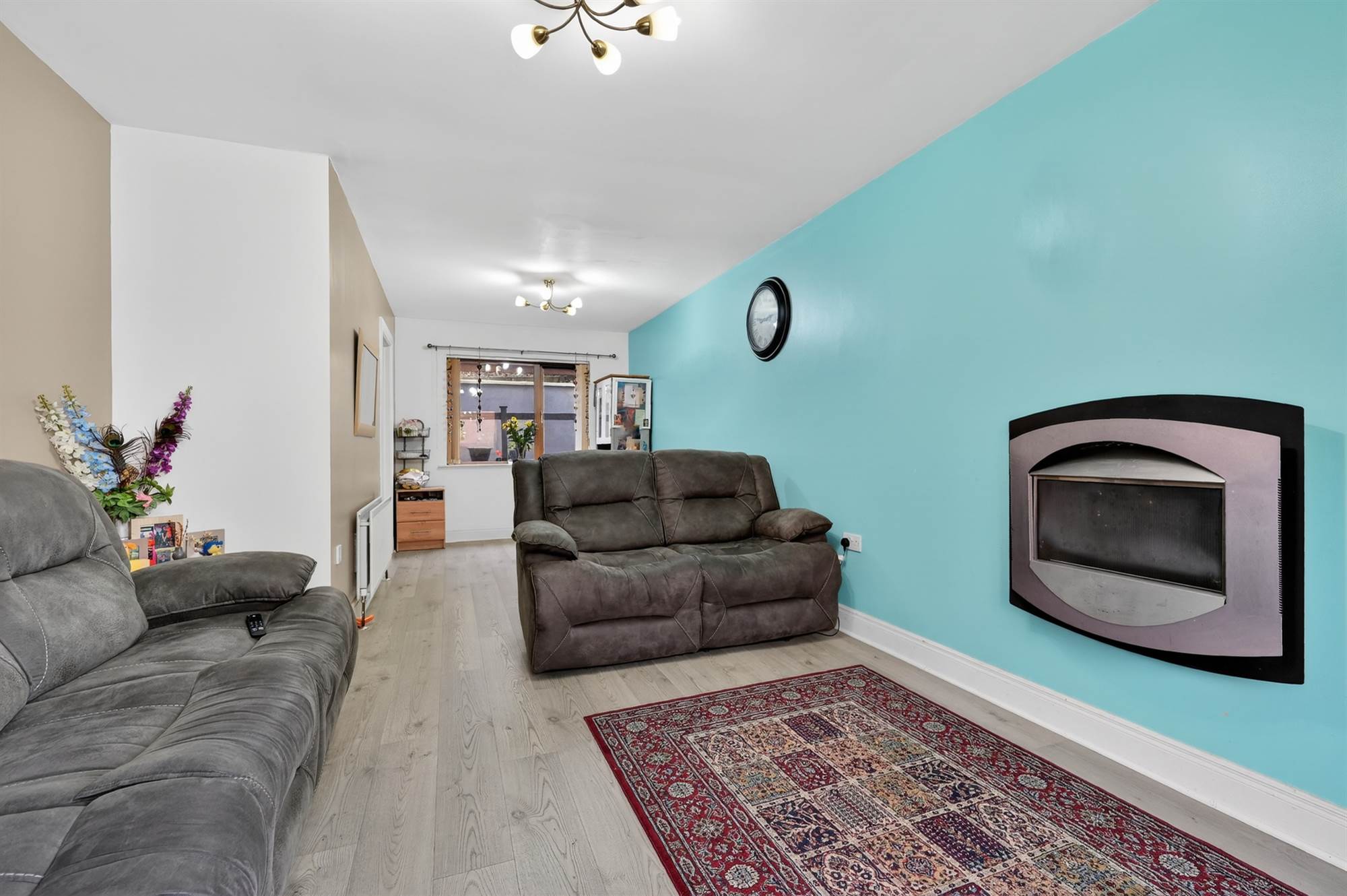 Laminate wood effect flooring, gas fire.