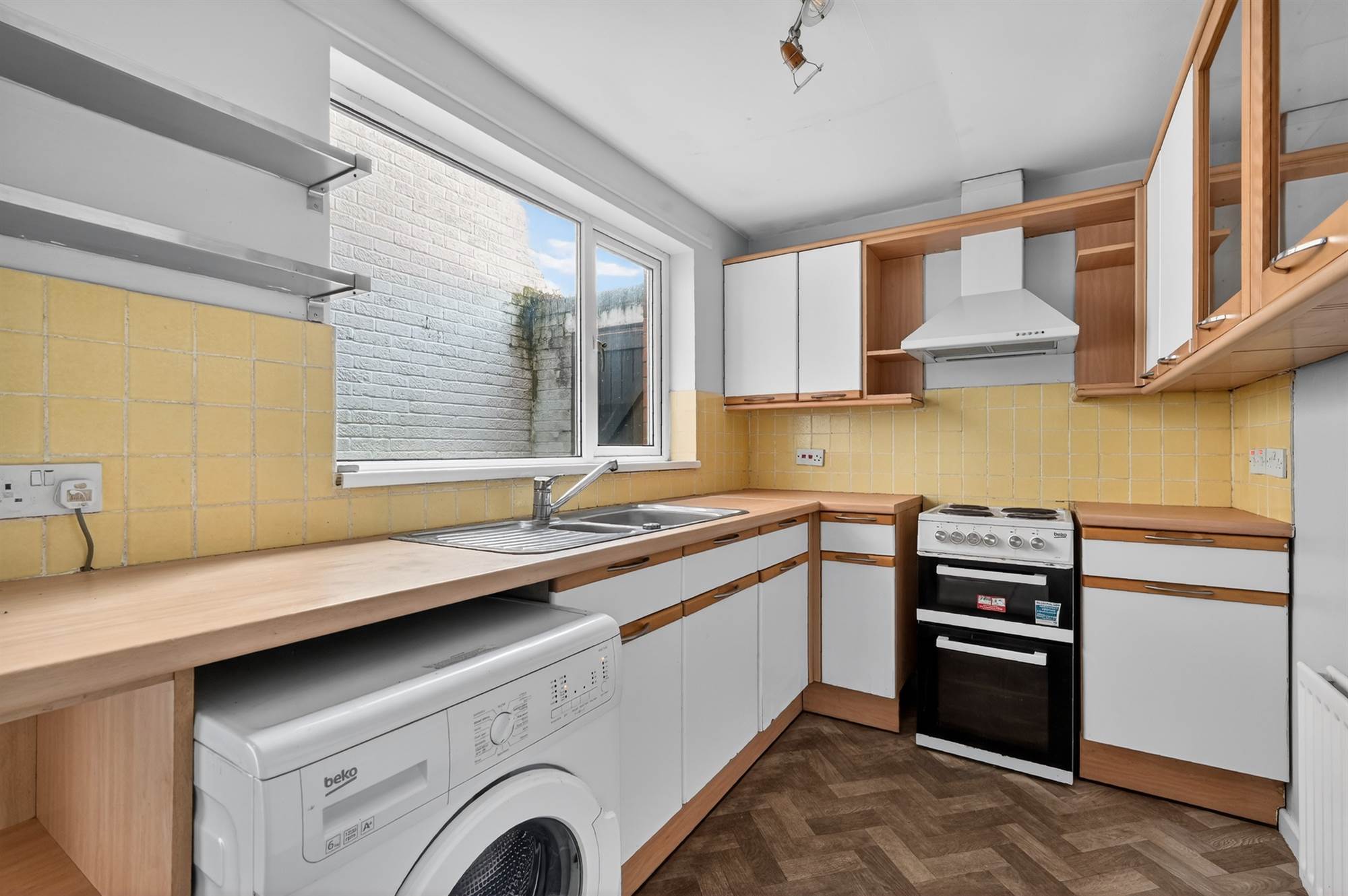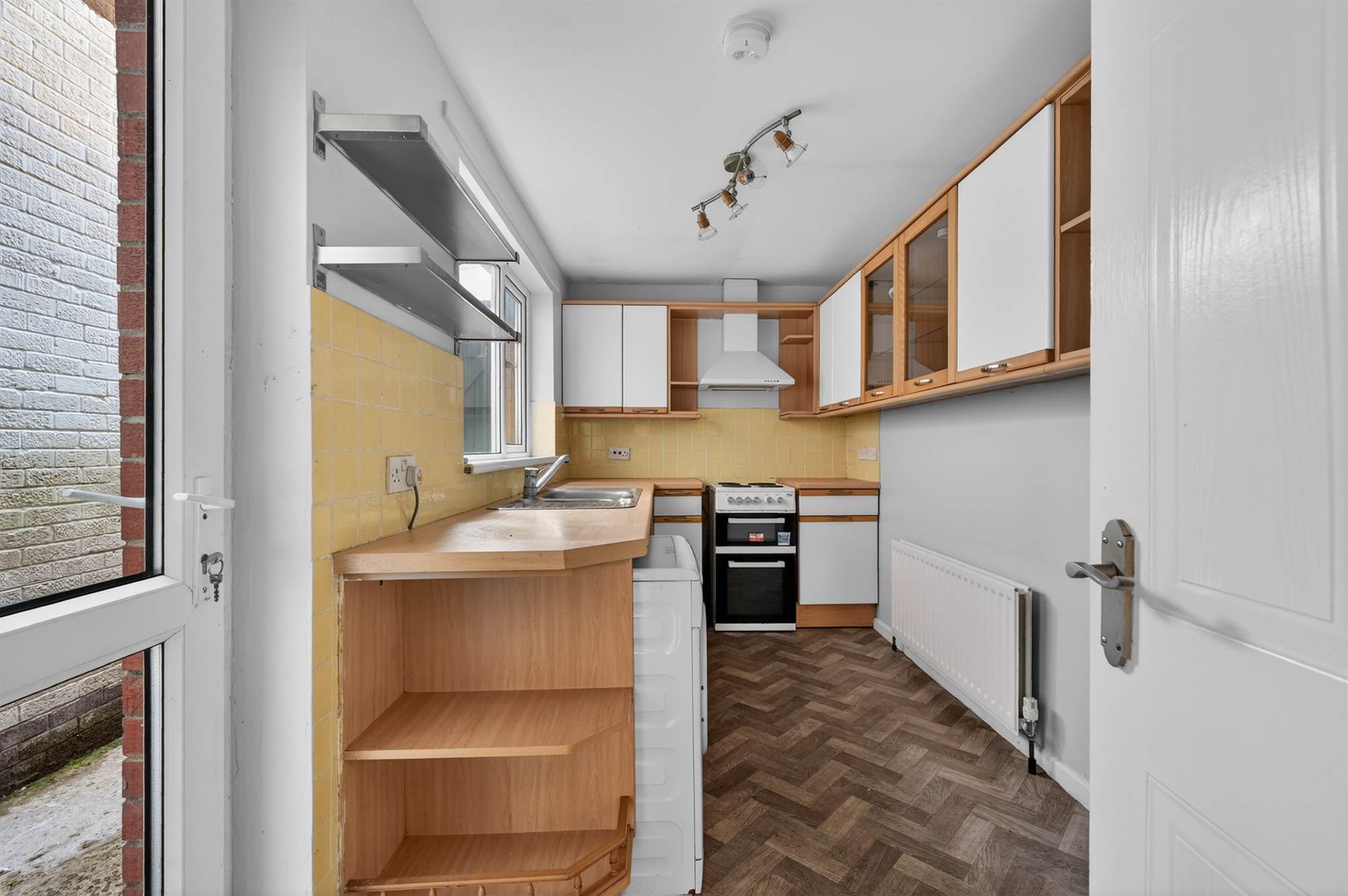 Range of high and low level units, laminate work services, plumbed for washing machine, stainless steele, single during sink and half sink unit, mixer taps, Extractor fan part- tiled walls, PVC double glazed access door to rear yard.