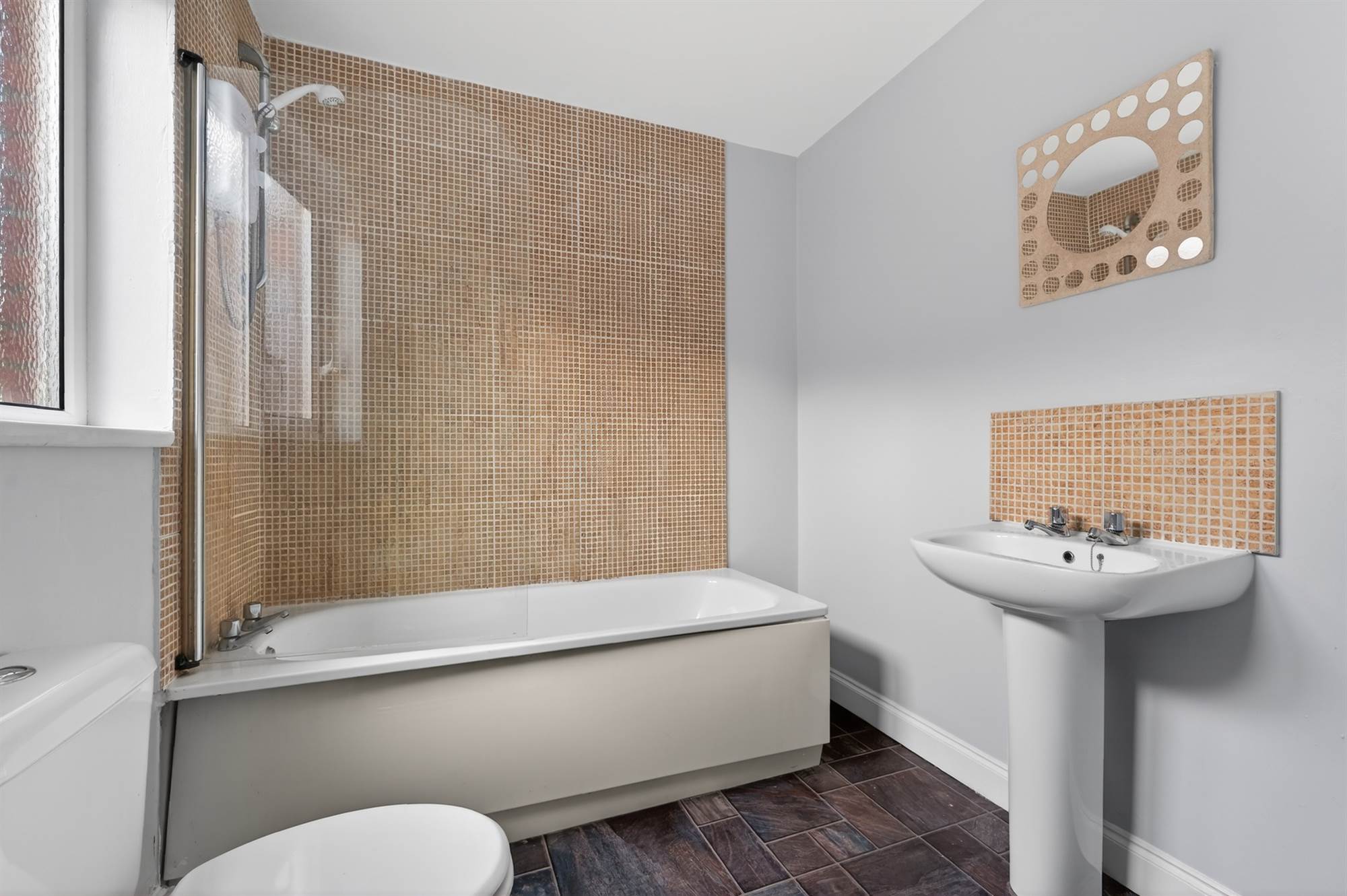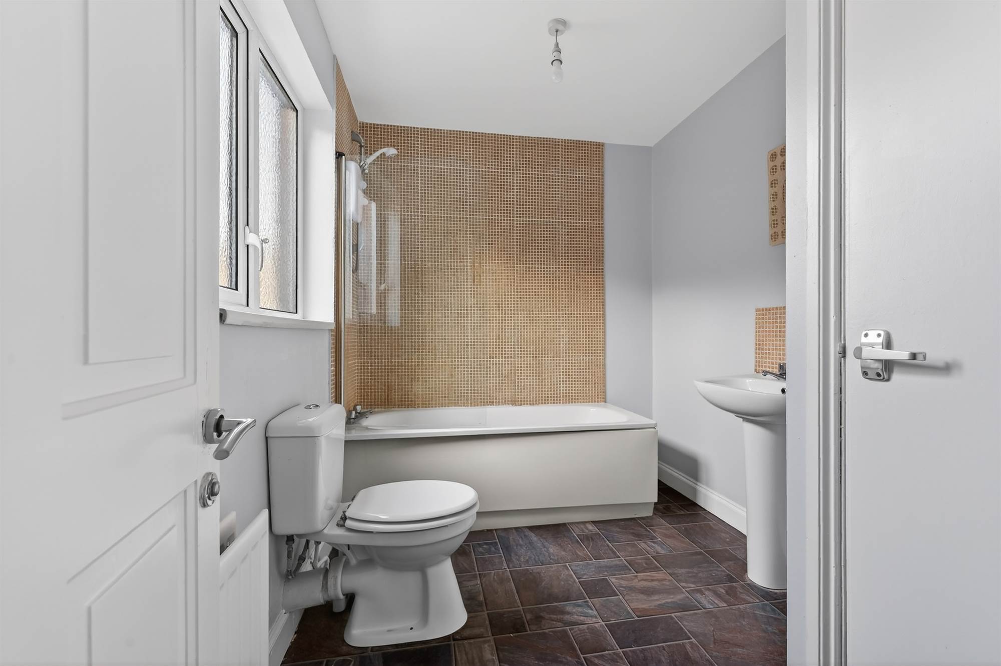 White suite comprising, low flush WC panelled bath, shower screen, built in Triton electric shower unit with tiled splashback, pedestal wash hand basin, concealed built in valiant gas fired boiler.