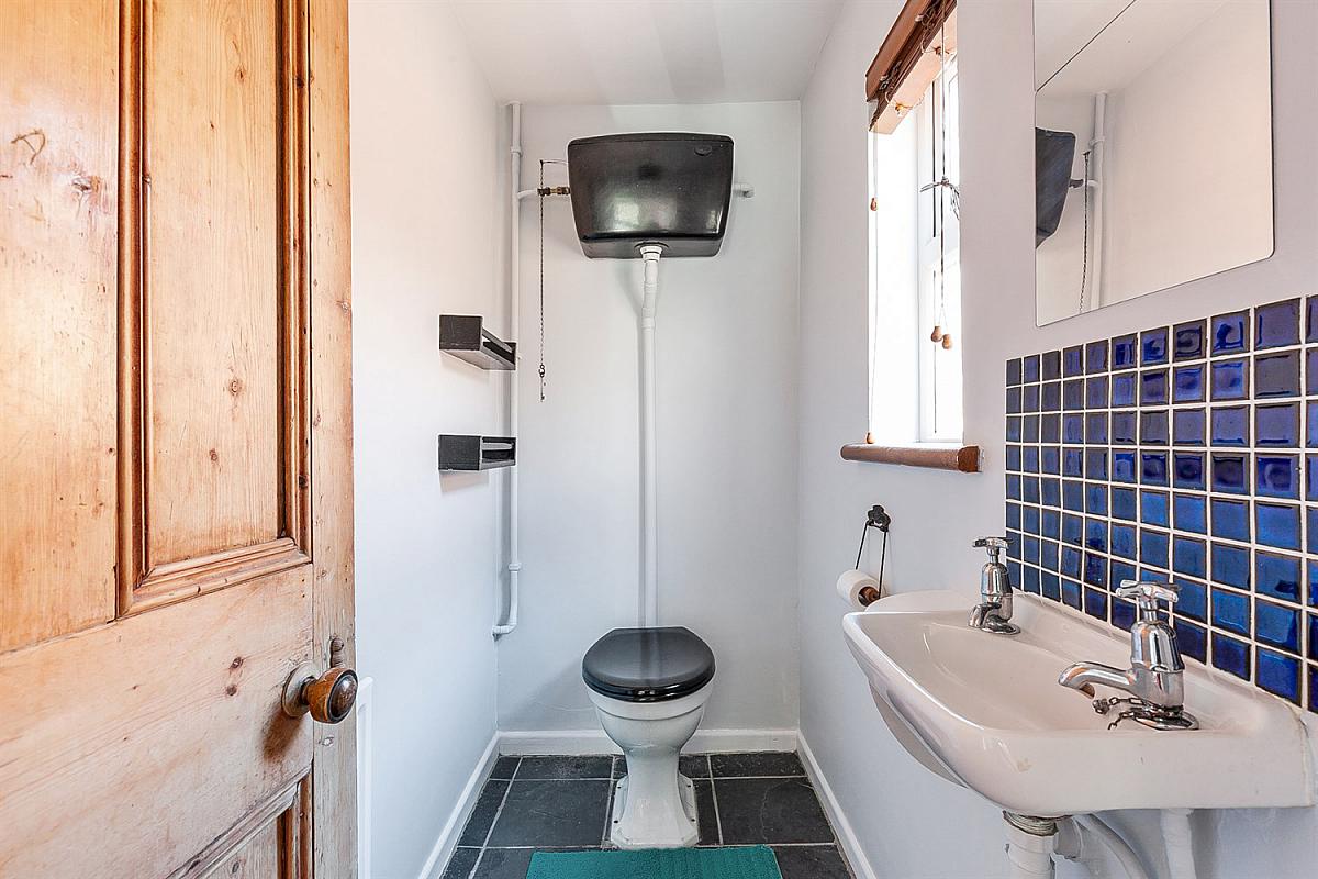 Low flush W.C, wash hand basin, tiled floor.