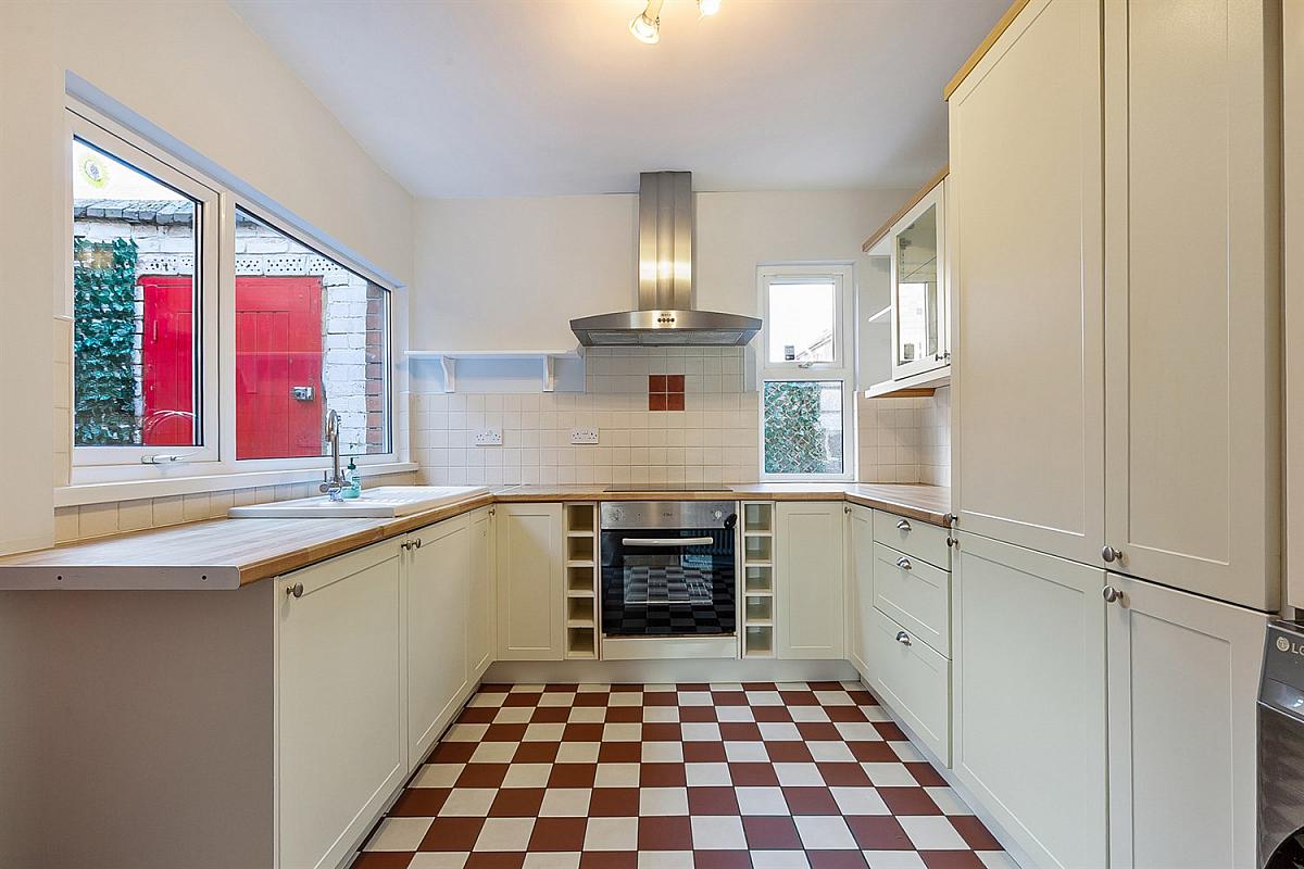 Full range of high and low level units, wood effect worktop, ceramic white 1½ bowl sink unit, four ring ceramic hob, stainless steel extractor hood, stainless steel oven, plumbed for washing machine, integrated fridge/freezer, part tiled walls, tiled floor. Door to rear...