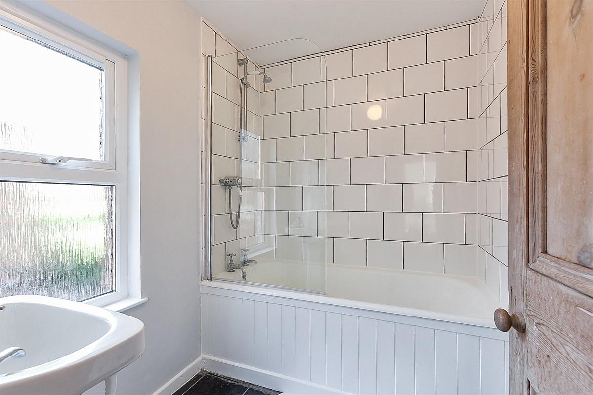 Panel bath with shower over and shower screen, pedestal wash hand basin with tiled splashback, part tiled walls, tiled floor.