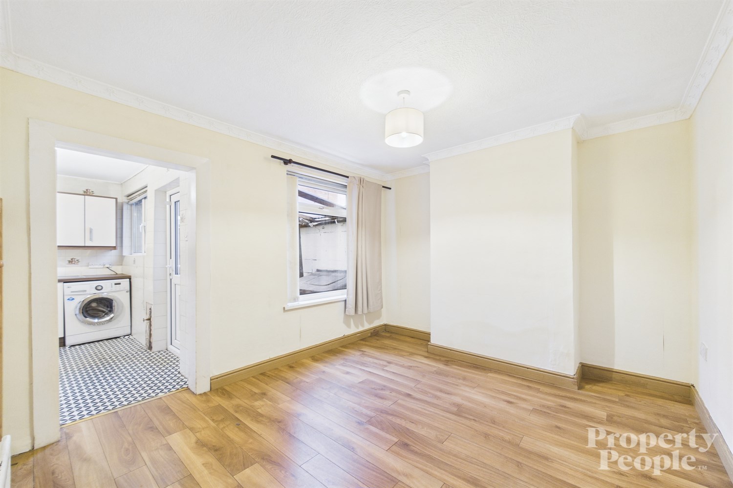 Separate dining room with aspect view to rear yard, laminate wooden floor and single panel radiator.