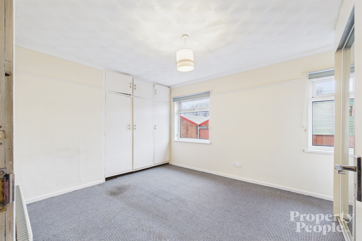Master bedroom with front aspect view, two sets of built in wardrobes utilising all available storage space, carpeted floor and a single panel radiator.