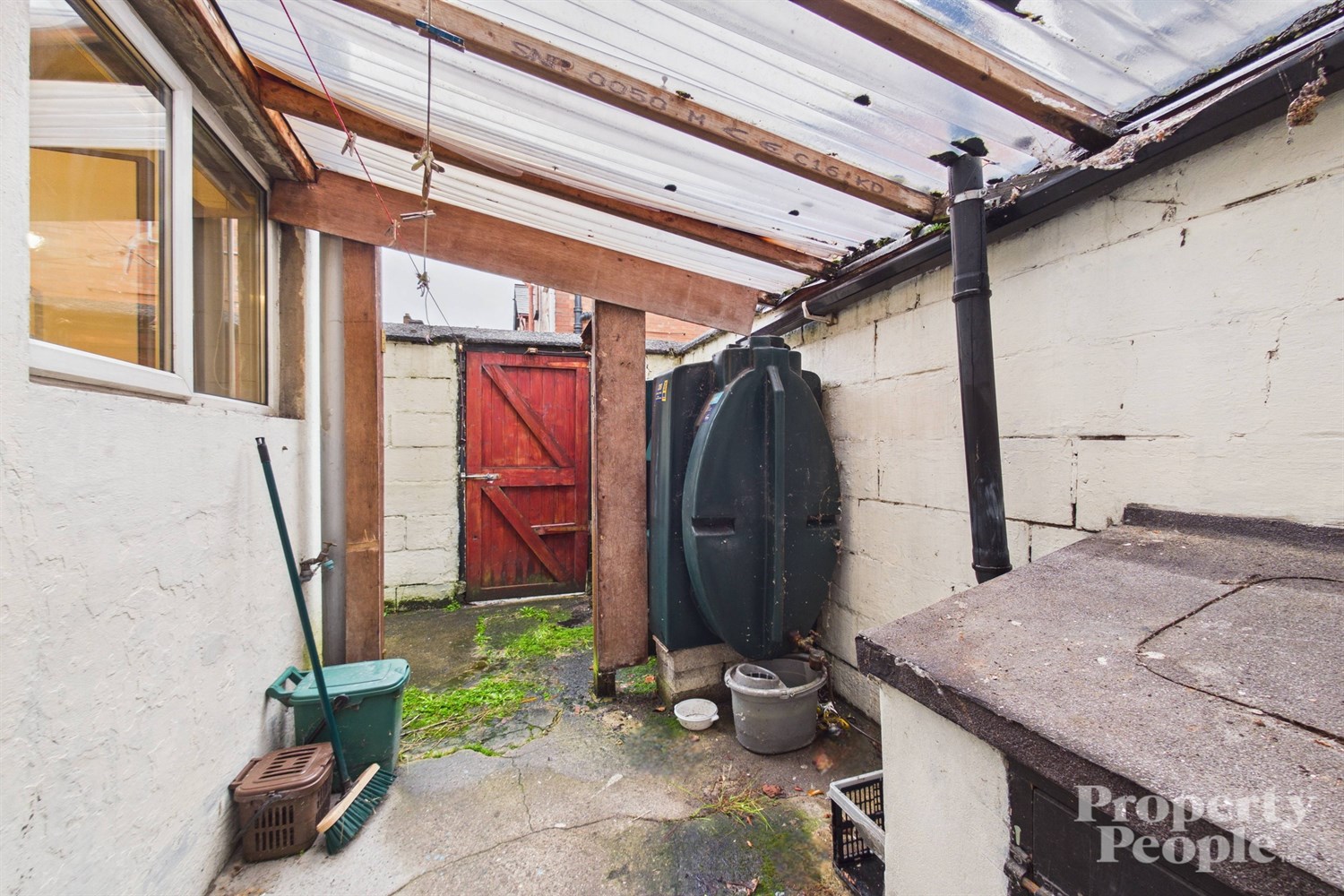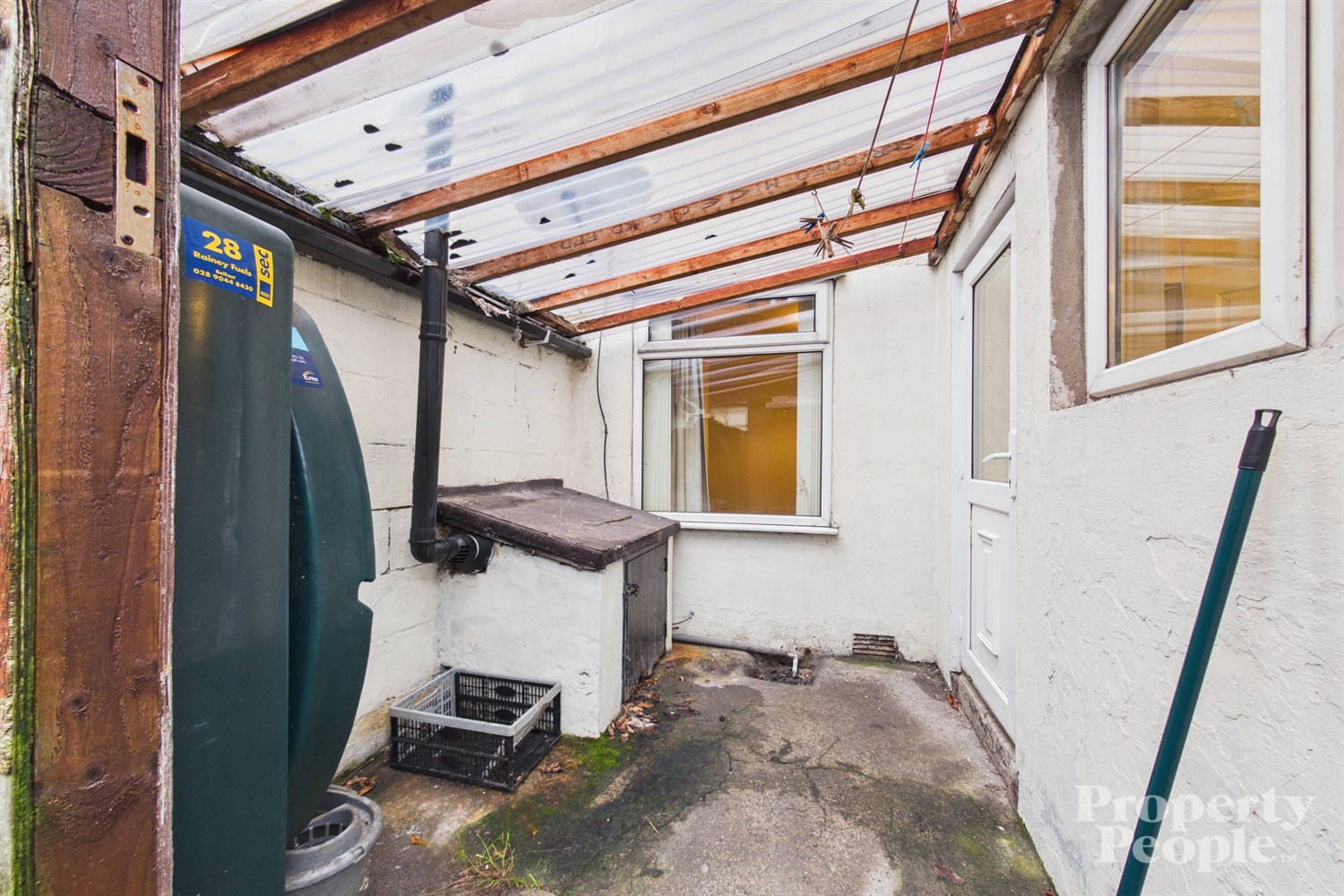 Enclosed rear yard housing the oil fired boiler and oil tank. Outside tap and storage shed.