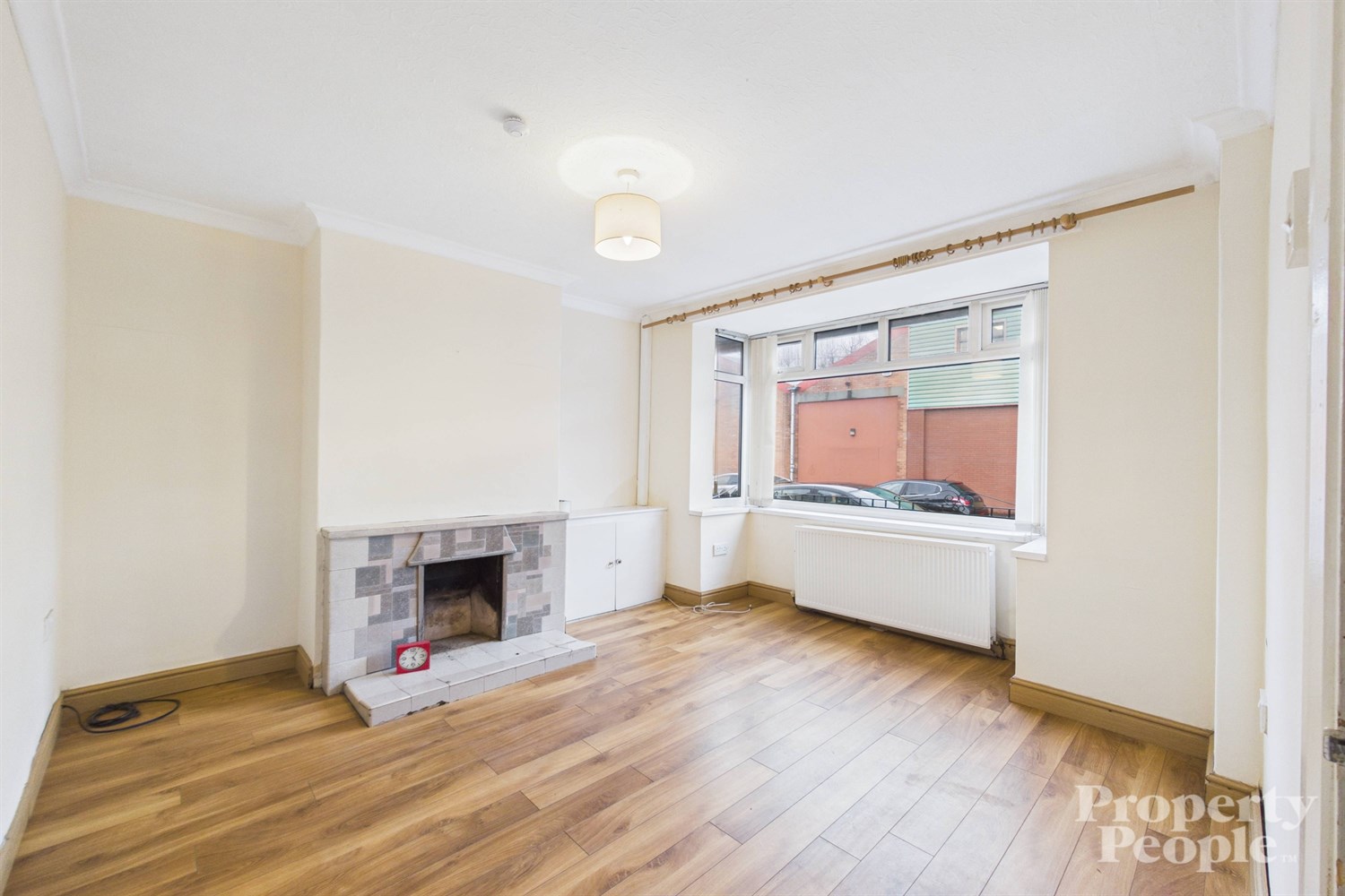 Bright living room with front aspect view to street parking, feature ceiling cornice, tiled open fireplace with tiled hearth, laminate wooden floor, double panel radiator and electrical cupboard.