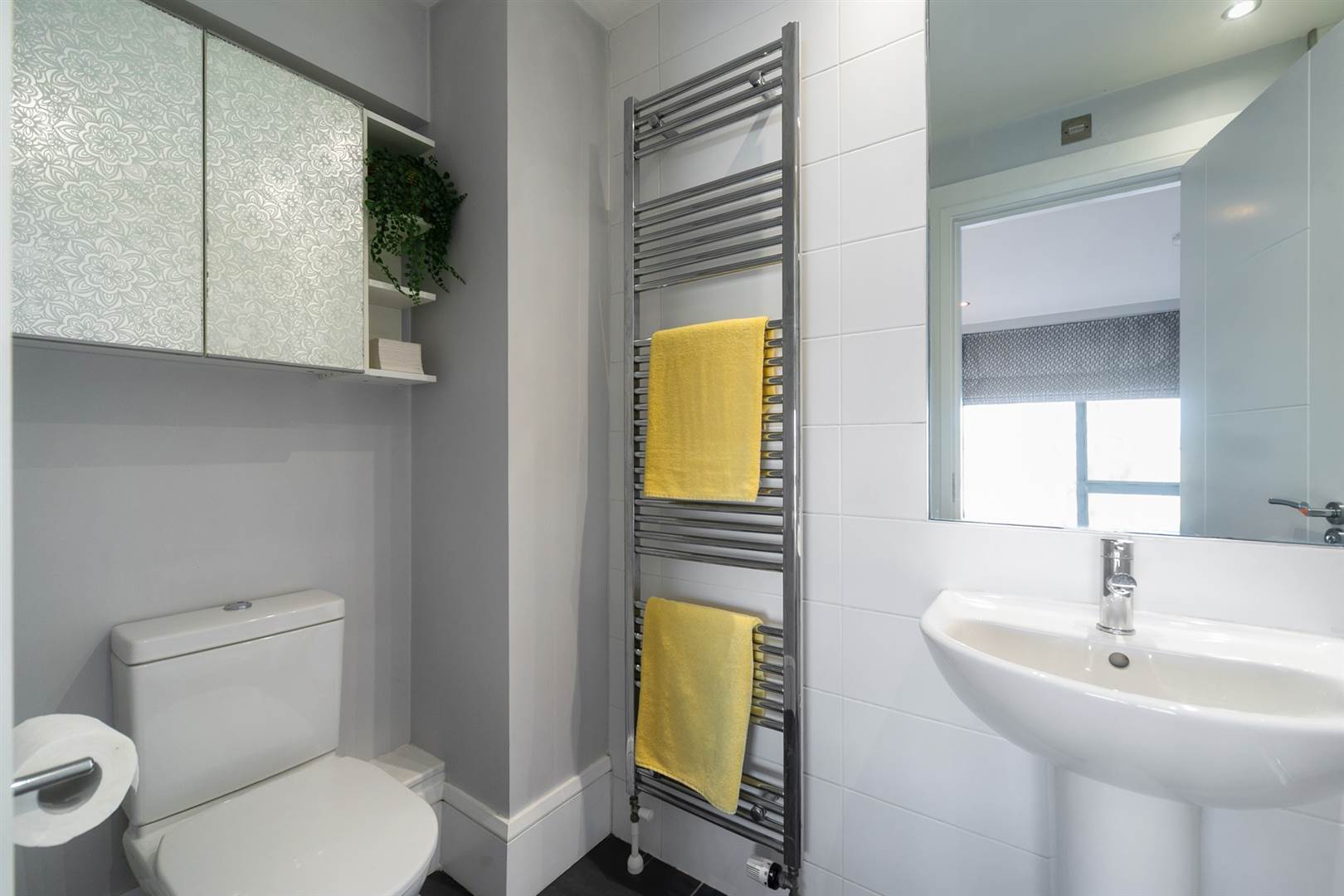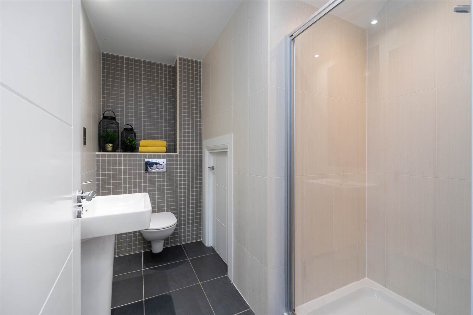 Double fully tiled shower cubicle with thermostatically controlled shower unit, pedestal wash hand basin and mixer tap, low flush wc, ceramic tiled floor, heated towel radiator, fully tiled walls.