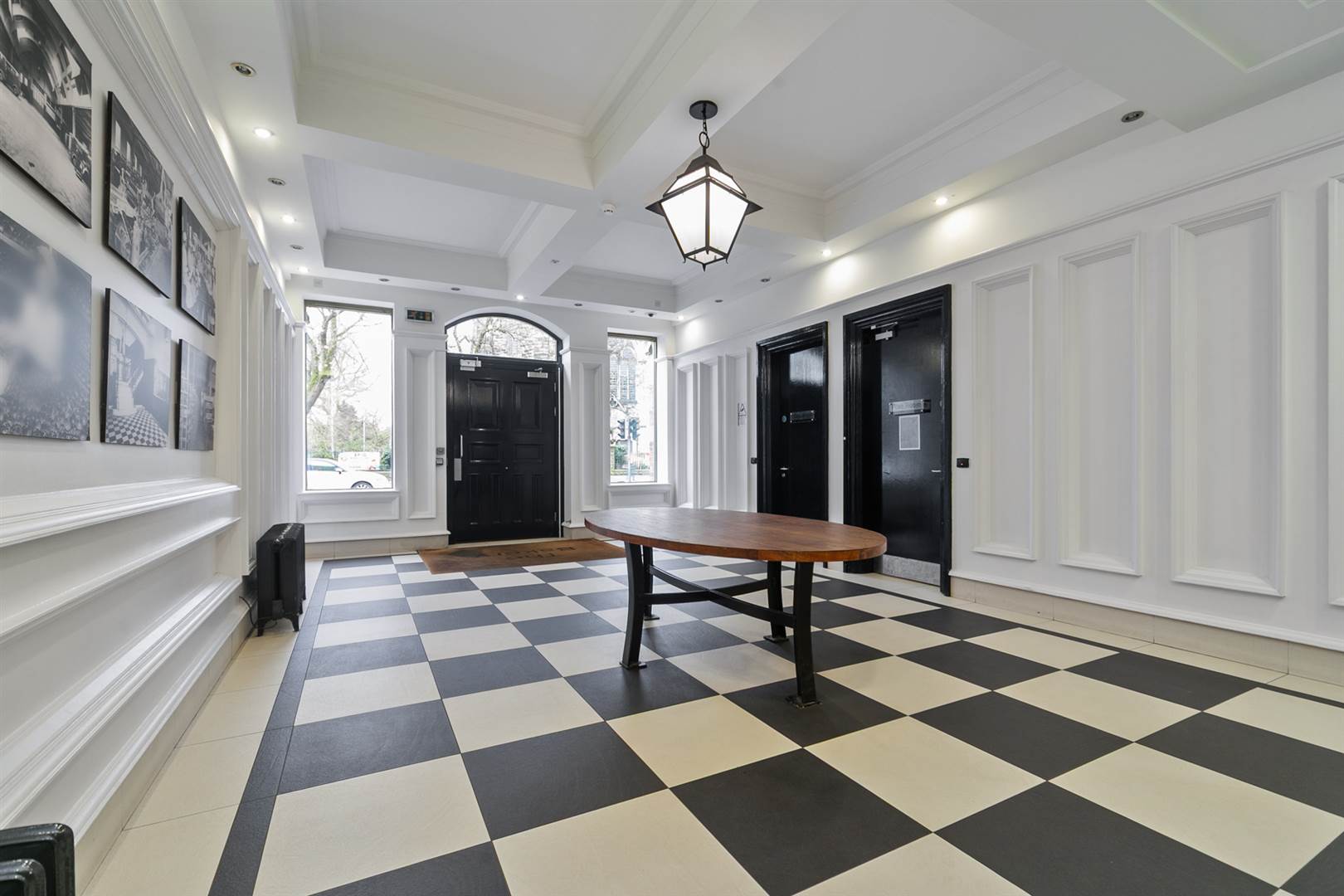 Black and white tiled floor. Concierge office. Panelled walls. Lift to each floor and access to the covered parking area.