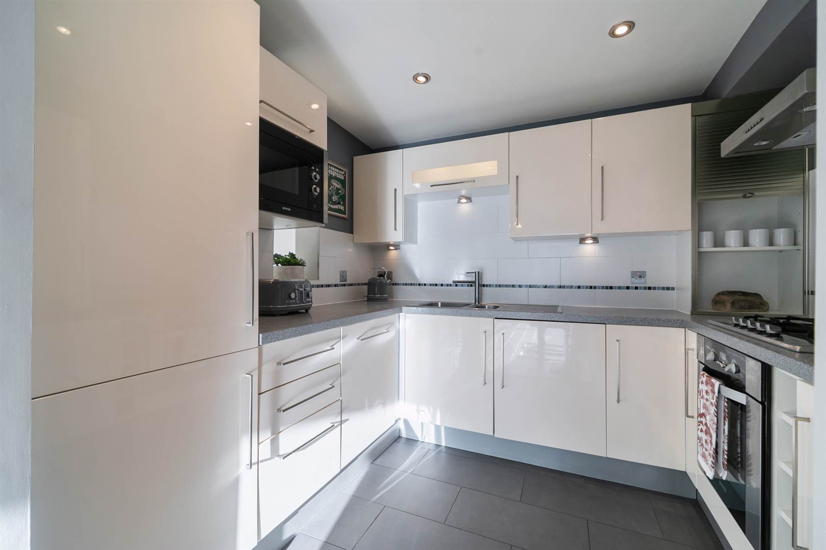 Extensive range of high and low level white high gloss cupboards, under unit lighting, one and a half stainless steel sink unit and mixer tap, composite stone effect worktops, five ring gas hob, under oven, integrated dishwasher, Gorenje eyelevel microwave, integrated fridge and freezer, Bosch integrated warming drawer, ceramic tiled floor, part tiled walls, low voltage lighting.