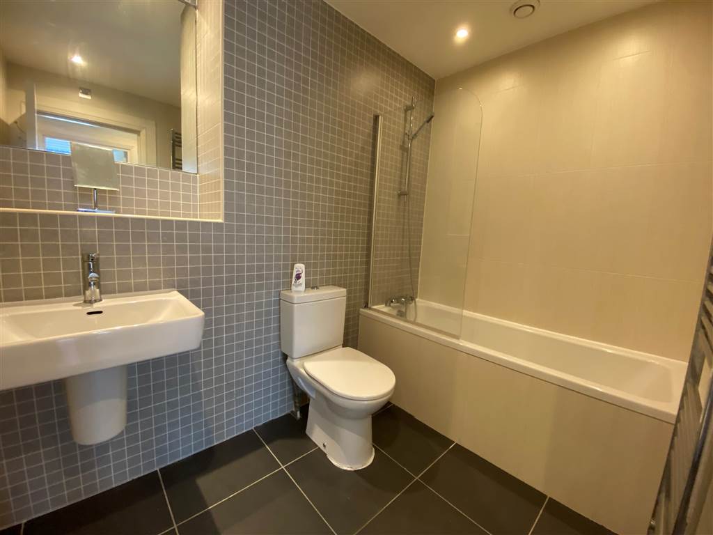 Tiled floors and fully tiled walls. Basin with mixer tap, cc wc, wall towel radiator. Panel bath with shower over. Extractor fan.