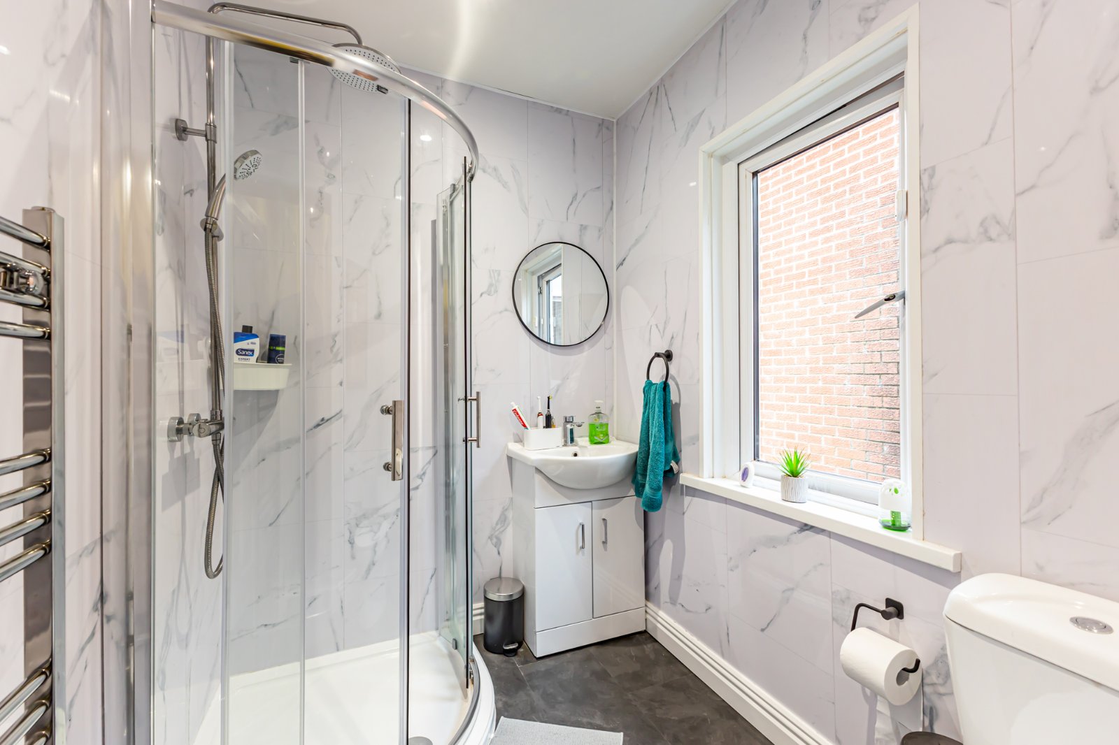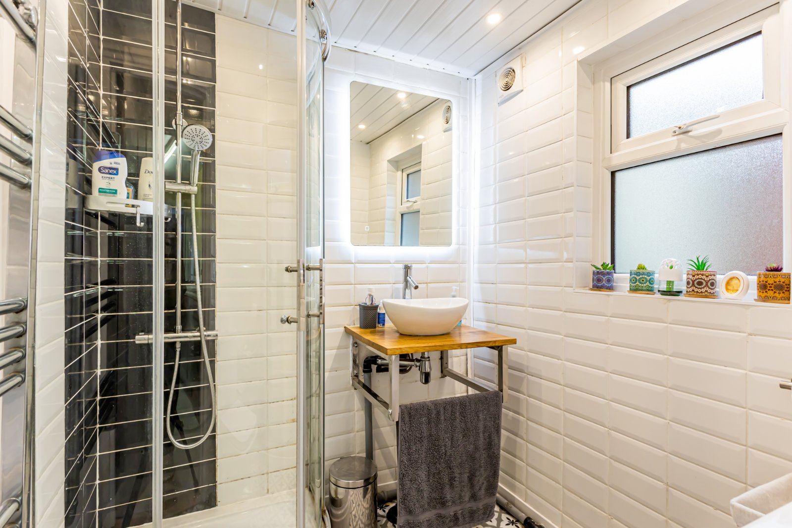 A modern shower room with white suite, to include a low flush wc, wash hand basin with mixer tap, and a shower cubicle with an overhead thermo-controlled shower unit. The bathroom has been beautifully finished with a tiled floor and tiled walls. There is also a heated towel rail.