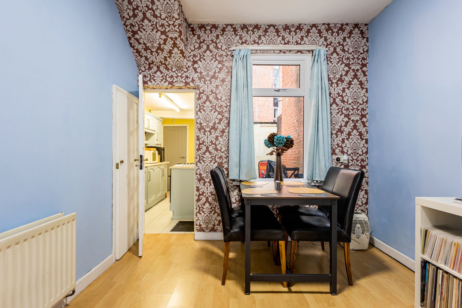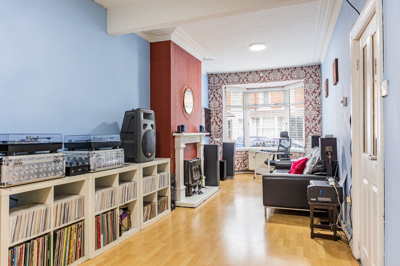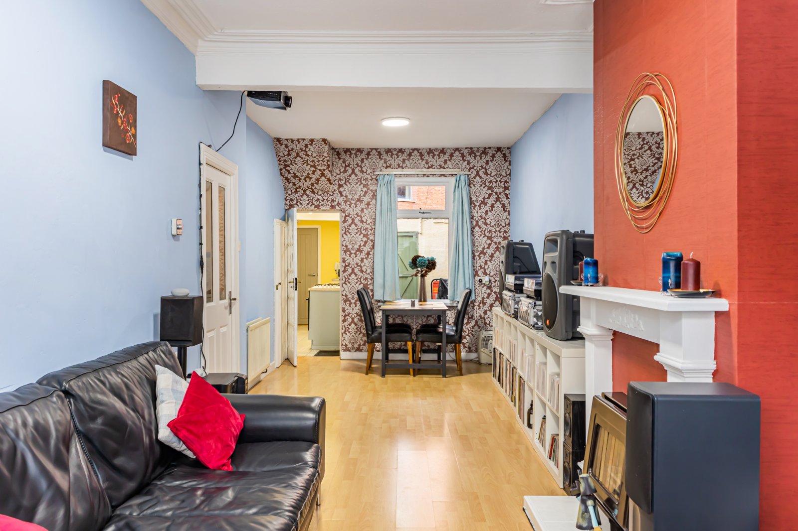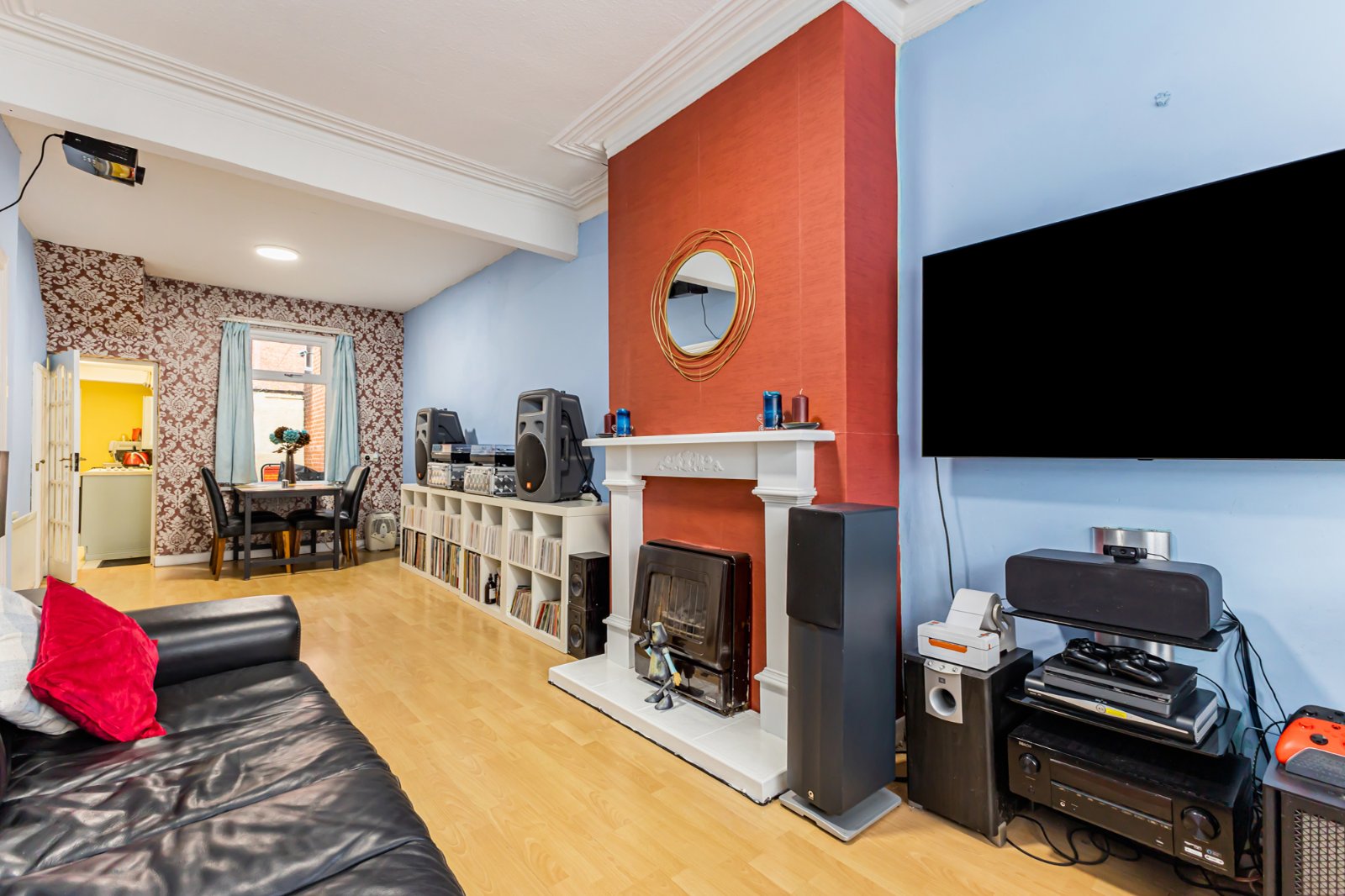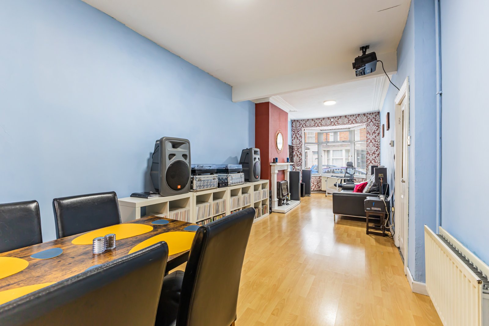 A spacious bay fronted living room, with dining space, laminate flooring, and cornicing.