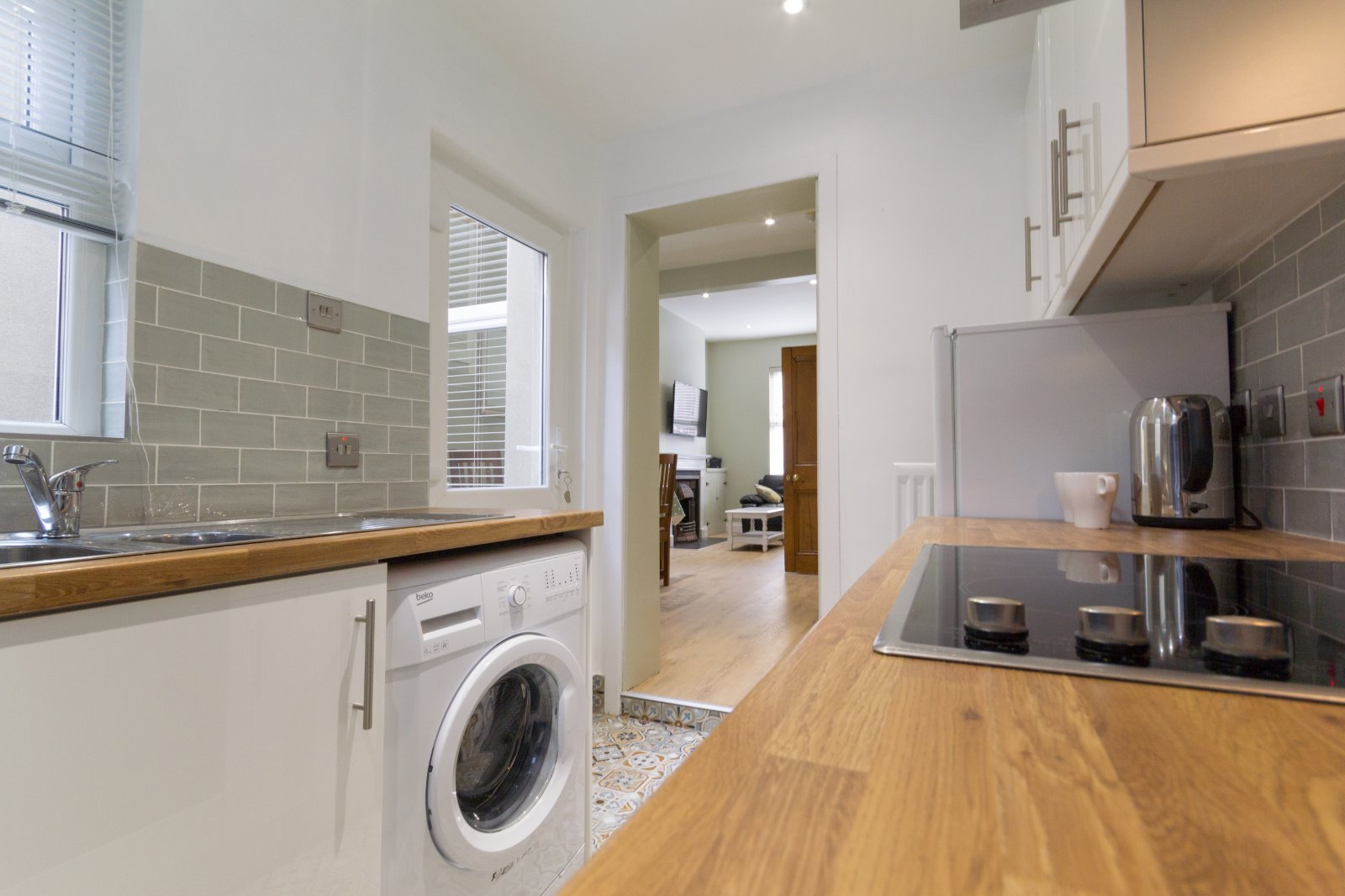 A beautifully finished kitchen with a good range of high and low level units, 1.5 drainer with mixer tap, stainless steel extractor hood and induction hob and oven. The kitchen has also been plumbed for a washing machine, and has been completed with a tiled floor, partially tiled walls and ceiling spotlights.