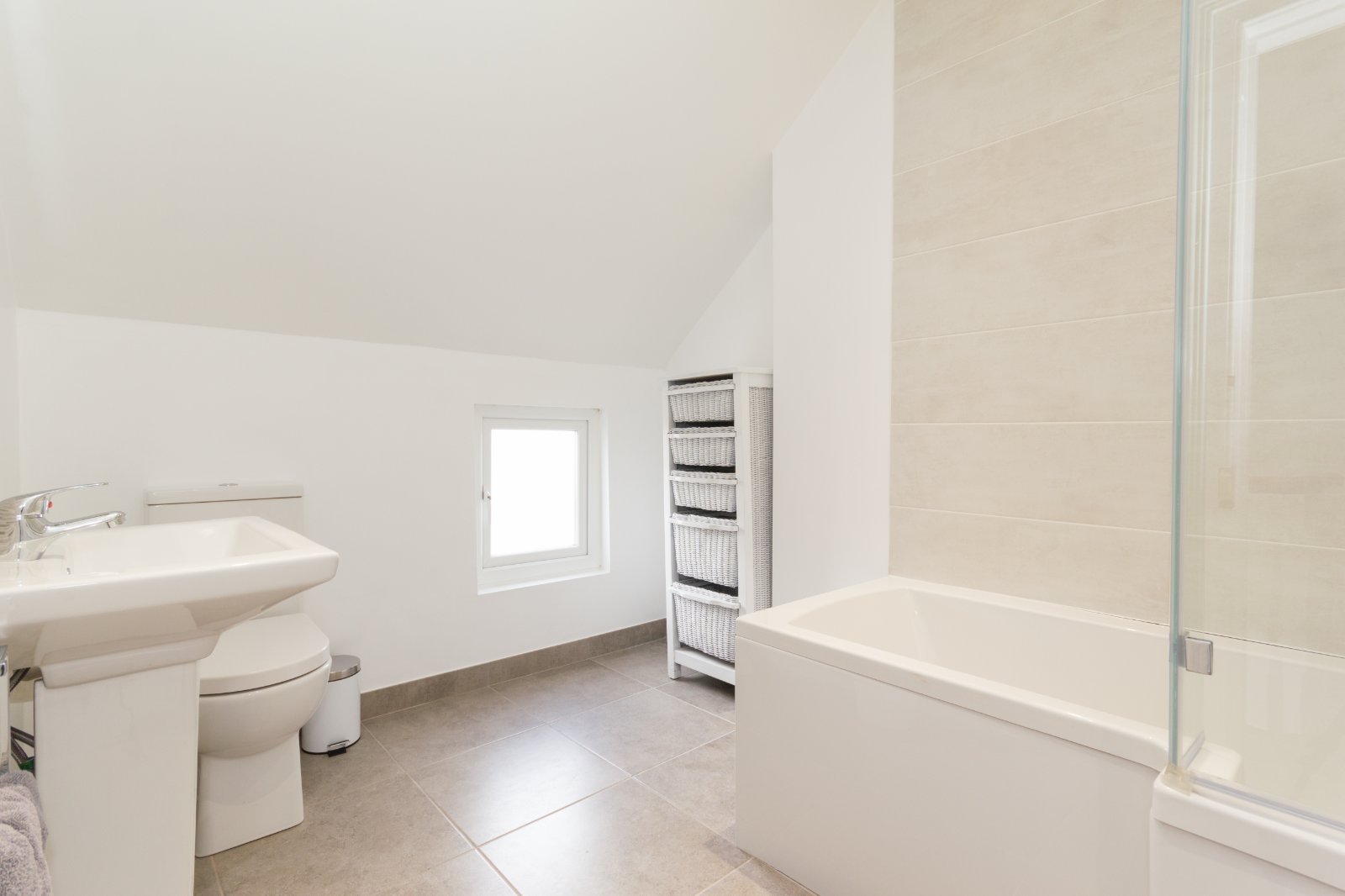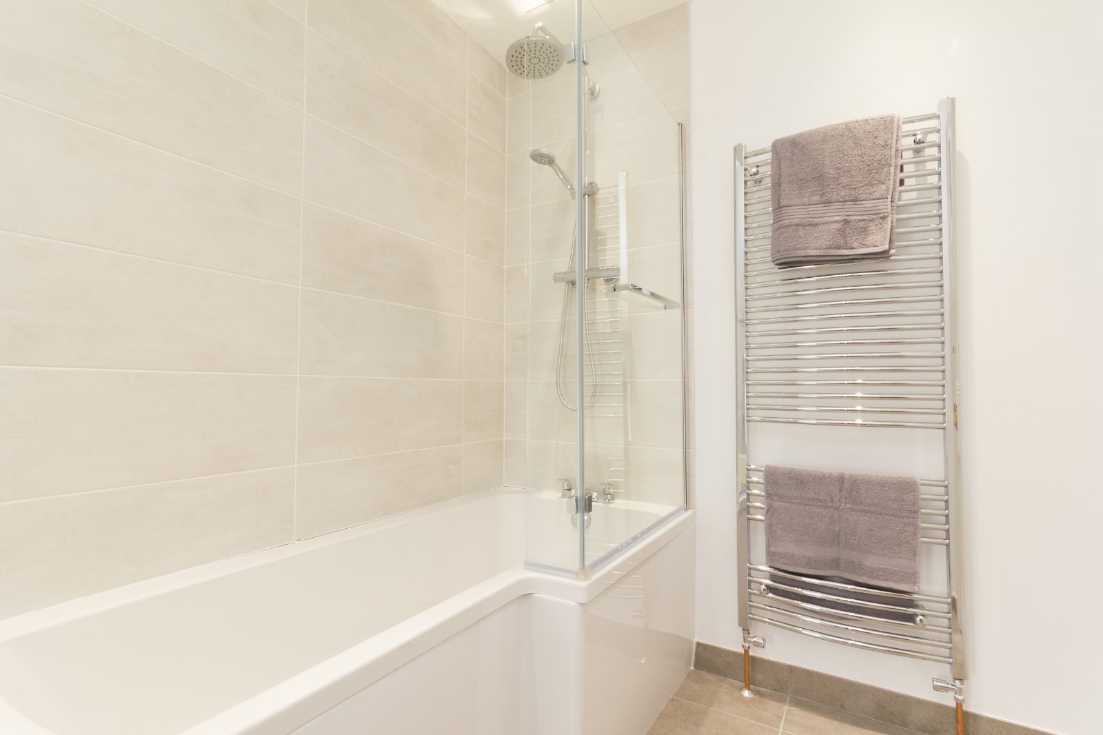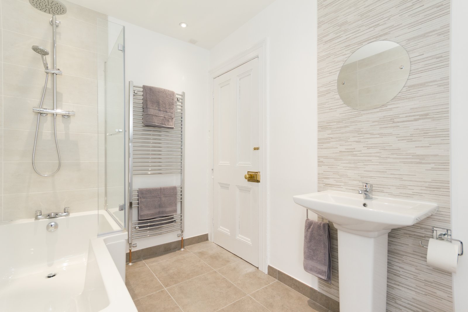 A fabulous bathroom suite with a large bath with mixer tap and thermo-controlled shower heads, a low flush wc, and wash hand basin with mixer tap and tiled splashback. The bathroom has been beautifully finished with a tiled floor and partially tiled walls, and also includes a heated towel rail.