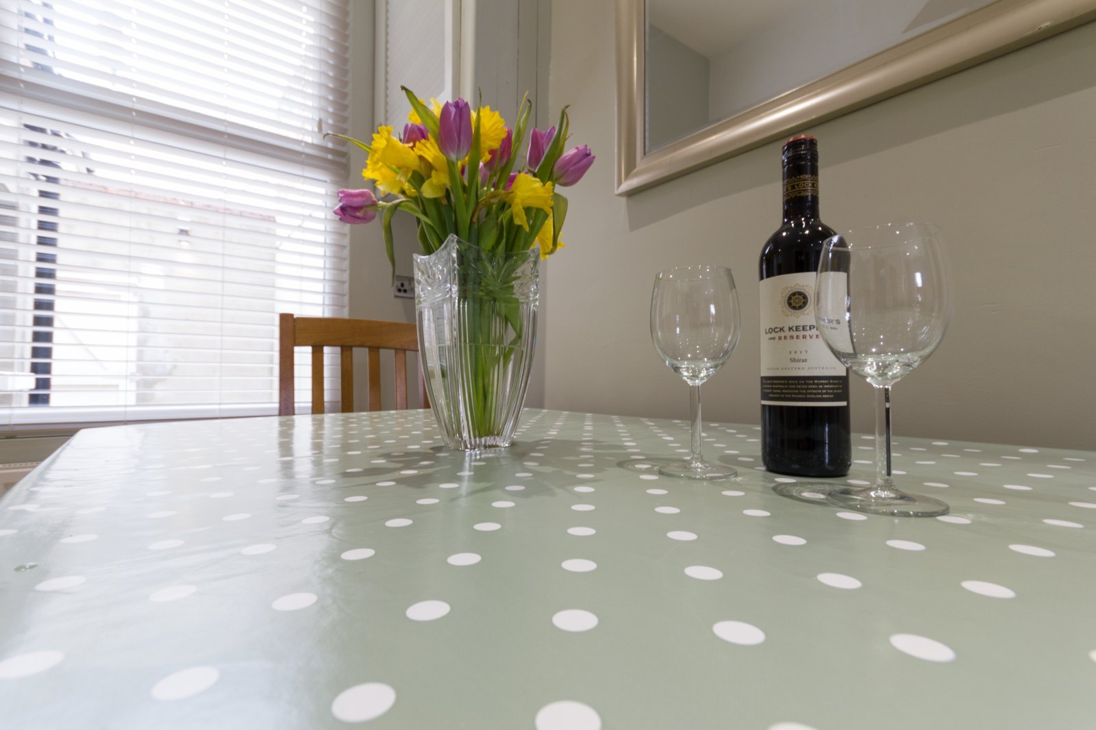 A bright and airy living and dining space with a laminate floor, cast iron fireplace, ceiling spotlights and an under-stair storage cupboard.