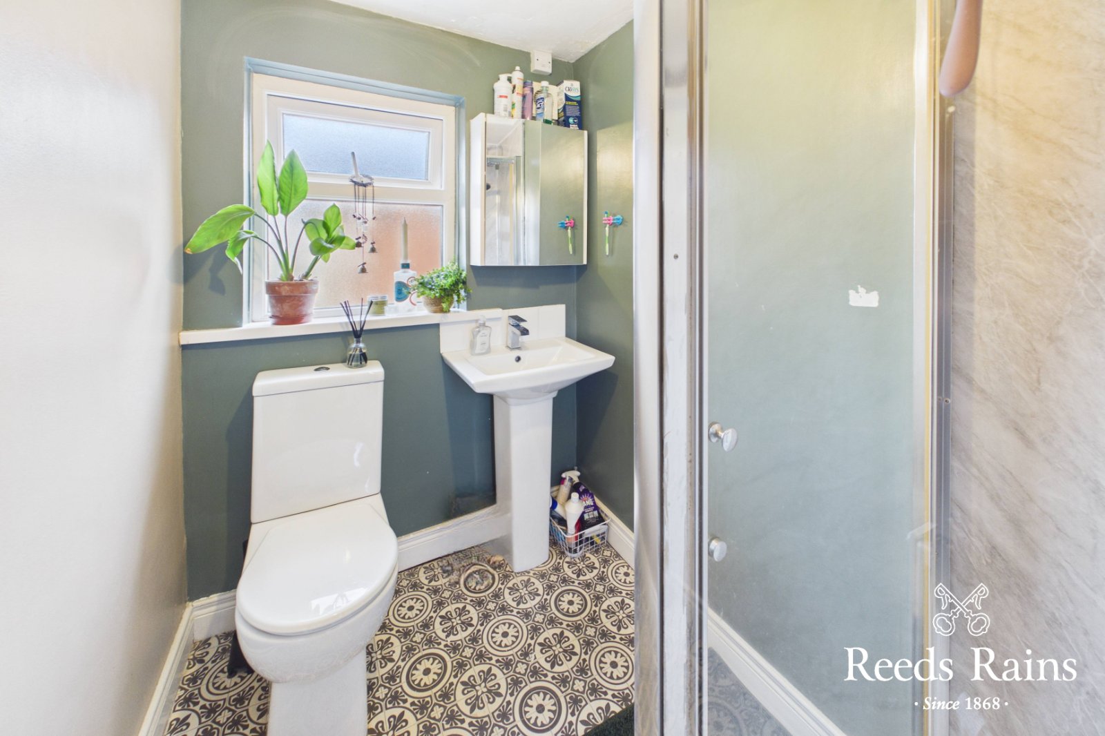 PVC panelled shower cubicle. Pedestal wash hand basin. Close coupled WC. Feature tiled floor.