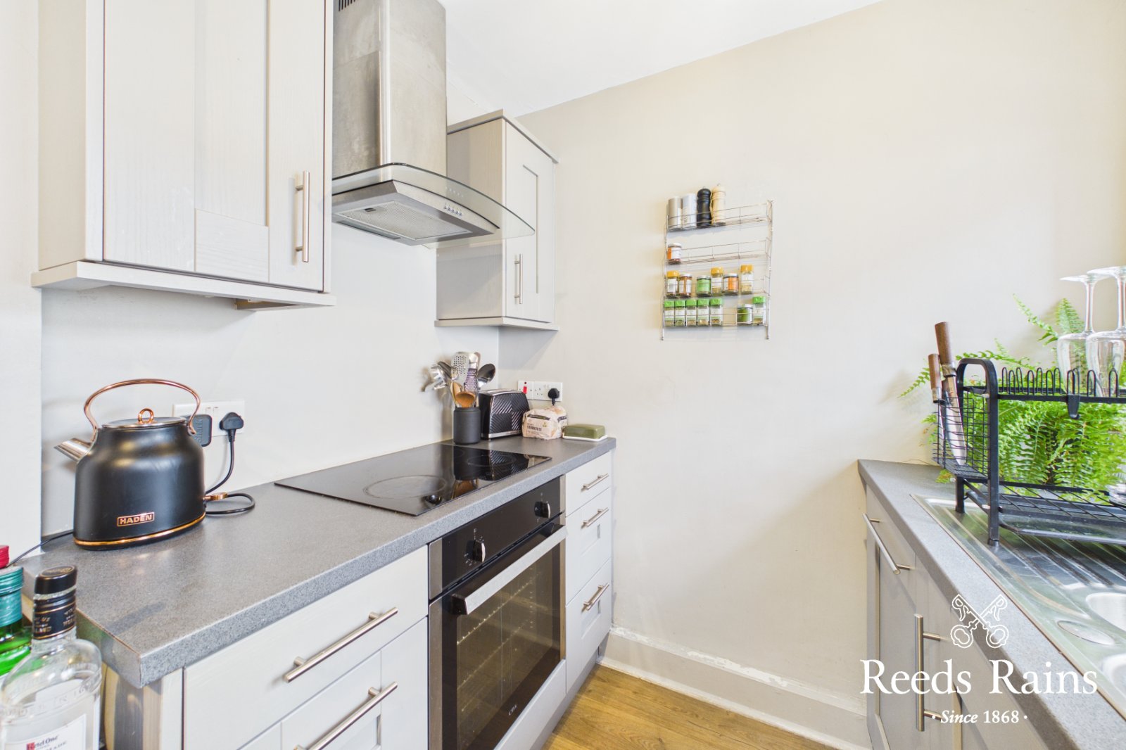Range of units. Integrated washing machine and dishwasher. Stainless steel 1.5 sink unit. Laminated work surfaces. Built in stainless steel oven and four rind ceramic hob, stainless steel chimney extractor fan. Space for fridge freezer. PVC door to rear.