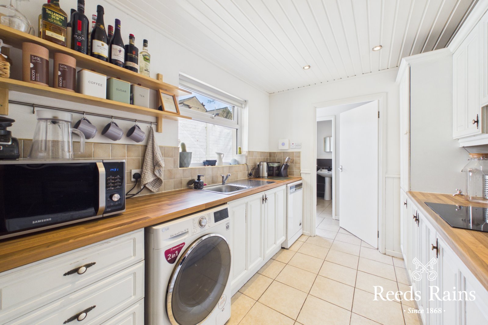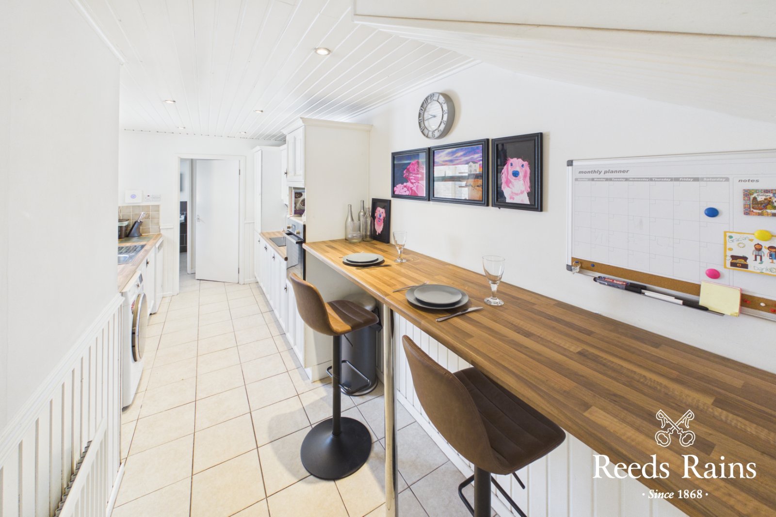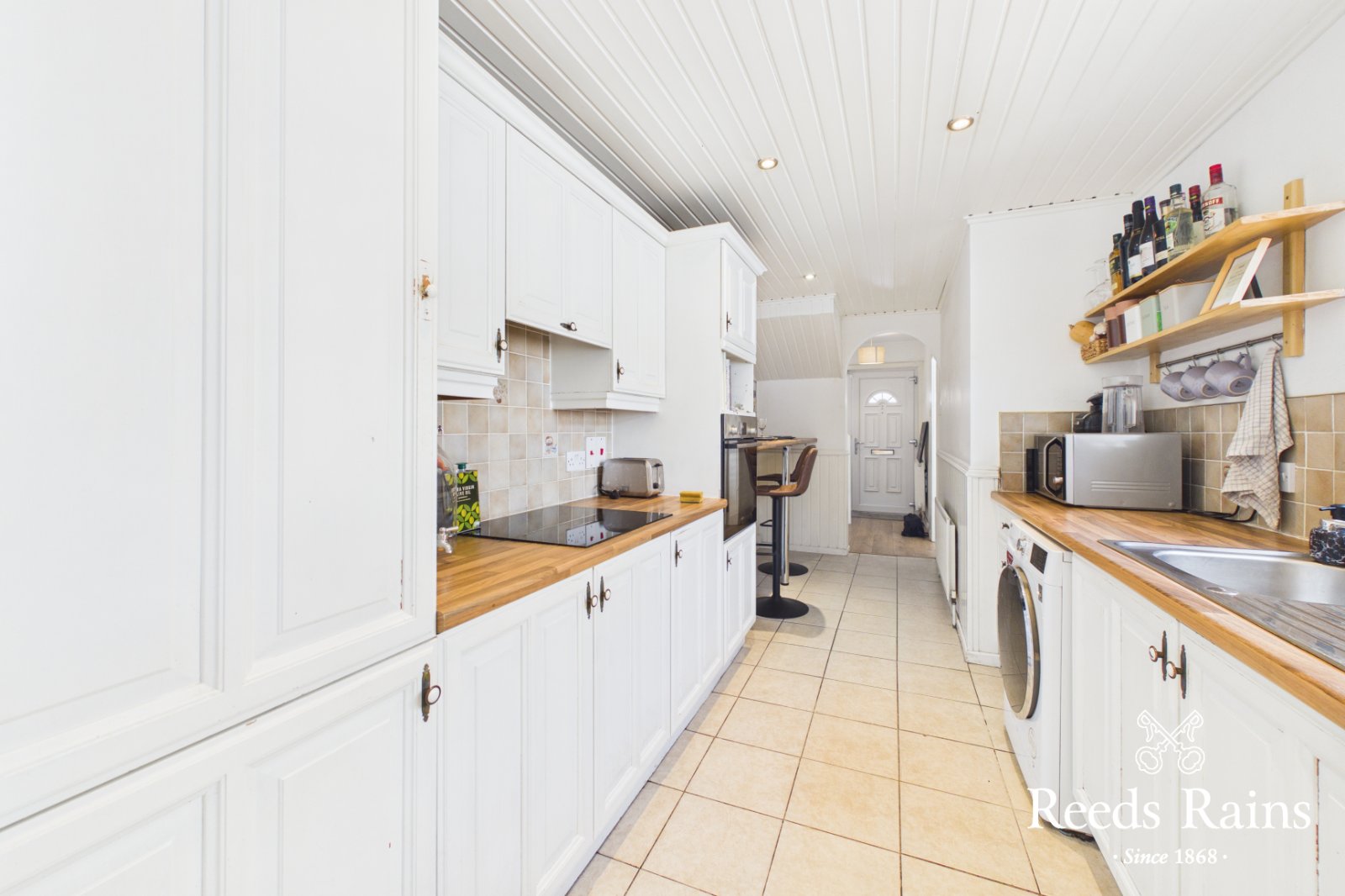 Range of high and low level units. Built in Bosch oven and separate hob and concealed extractor fan. Single drainer stainless steel sink unit with mixer taps. Breakfast bar with seating space. Part tiled walls. Integrated fridge and freezer. Ceramic tiled floor. Laminated work surfaces. Plumbed for washing machine.