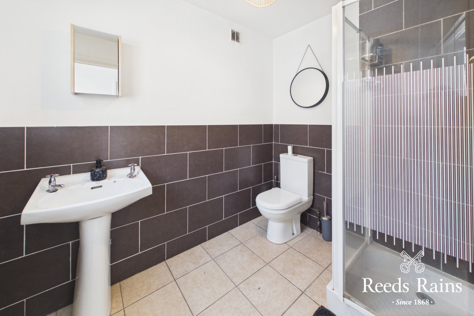 Built in shower cubicle with electric shower. Pedestal wash hand basin. Low flush WC. Part tiled walls. Ceramic tiled floor. Extractor fan.