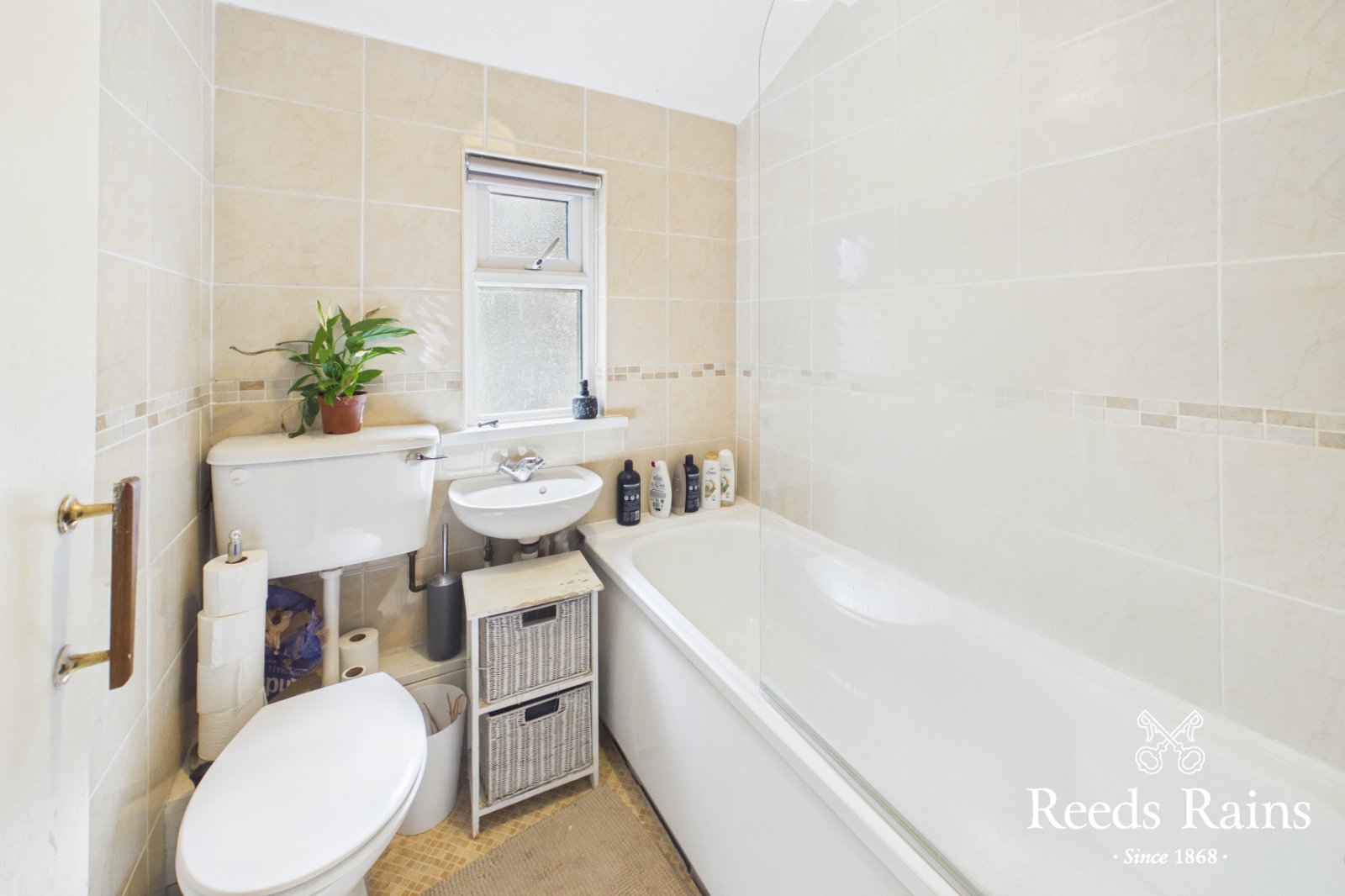 Panel bath with shower screen, telephone hand shower and additional drench shower. WC. Wash hand basin. Fully tiled walls.