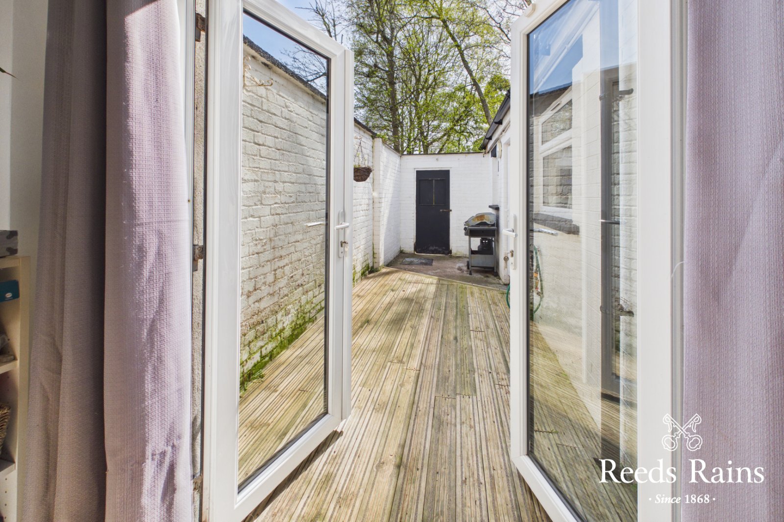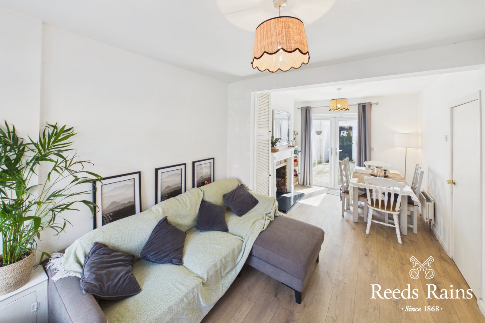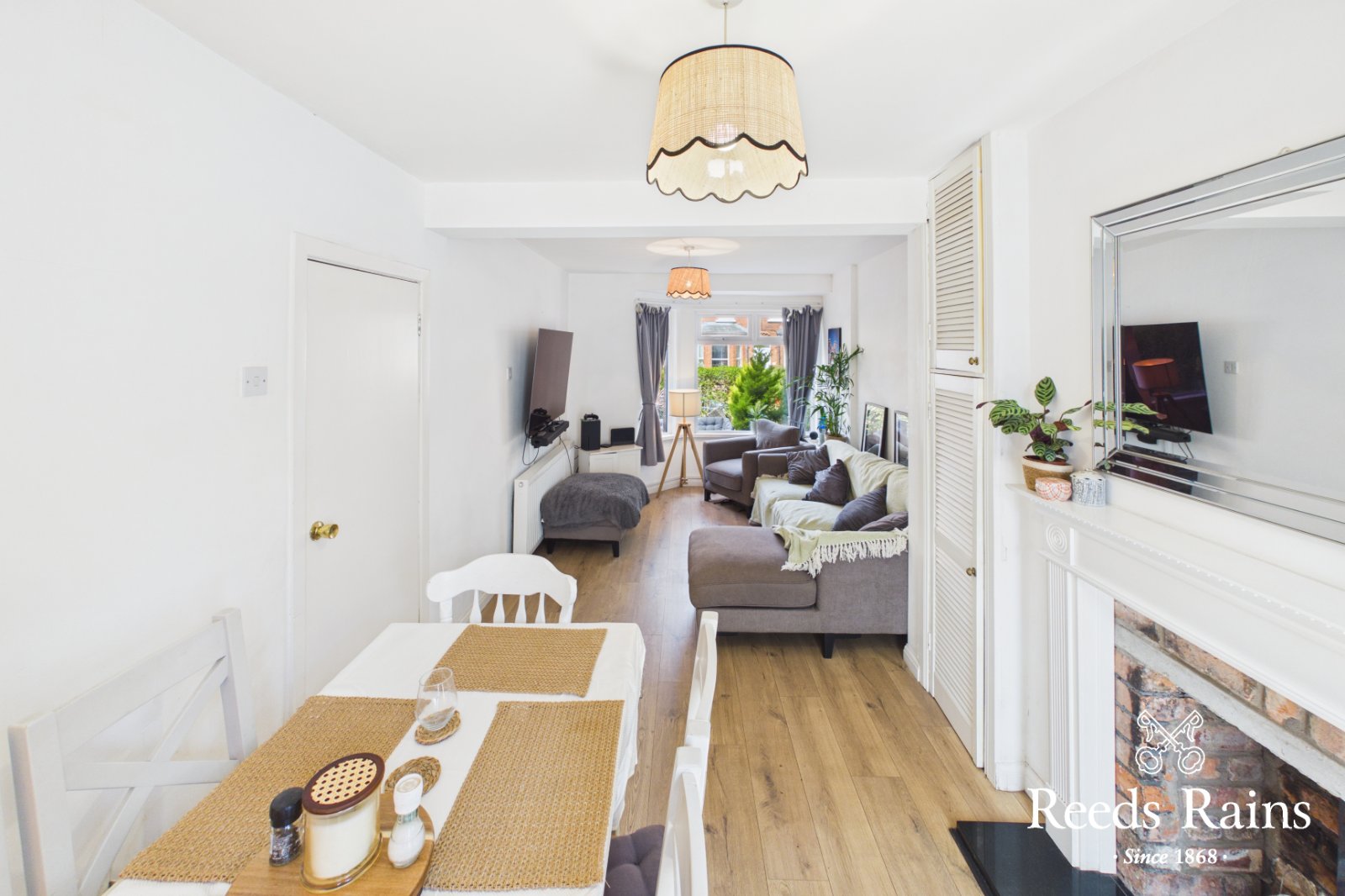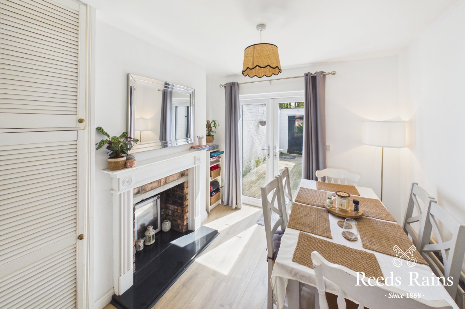 Feature wooden flooring. Bay window. Feature fire place with natural brick inset & wooden surround. French doors to decked area.
