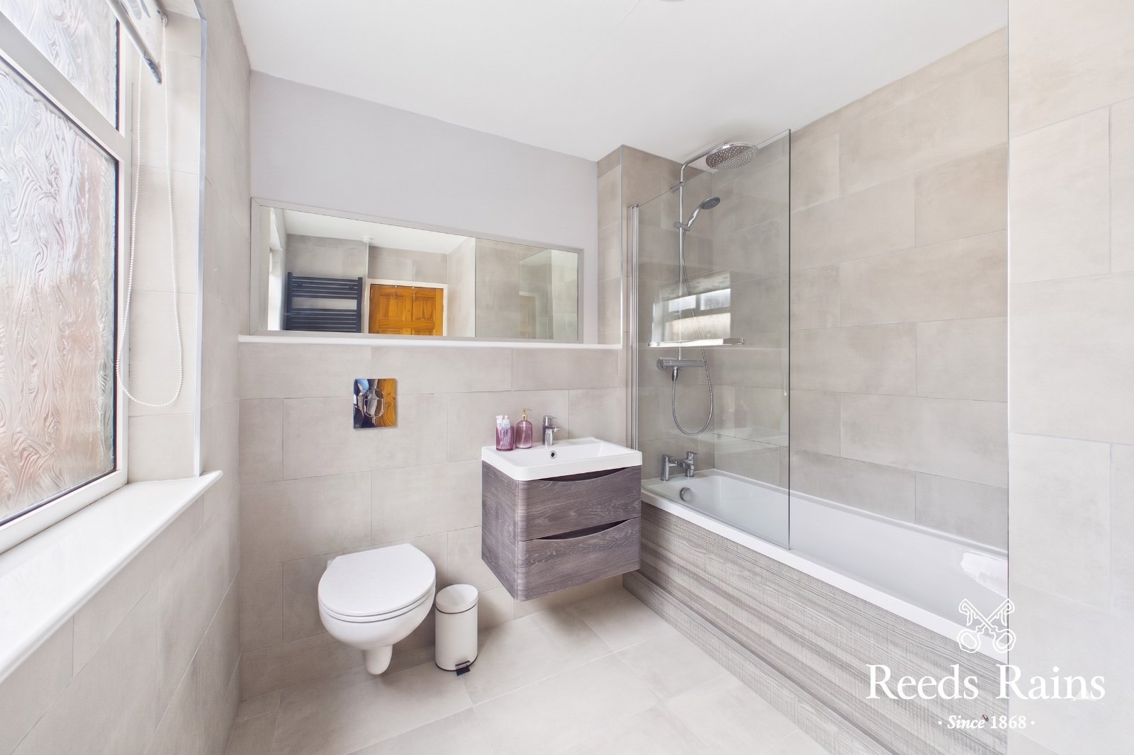 Panel bath with Grohe mixer taps. Shower screen. Grohe Telephone hand shower and additional drench shower. Vanity unit. Grohe Wall Hung dual flush WC. Porcelain Fully tiled walls and floor.