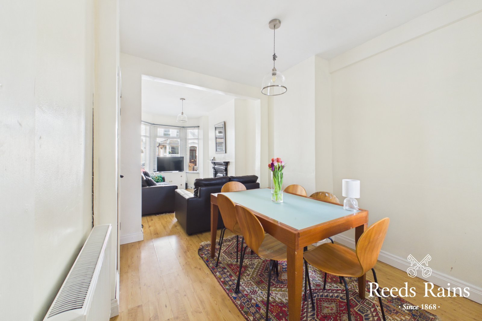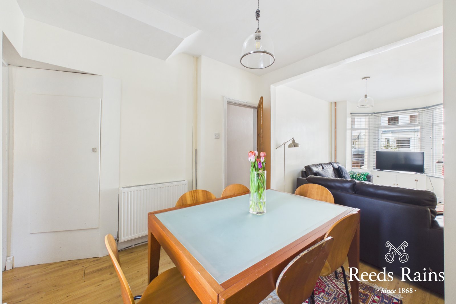 Spacious lounge/dining room with bay window, feature fire place and laminate wooden flooring. Under stairs storage cupboard. Feature cast iron fireplace. Glazed inner door to...