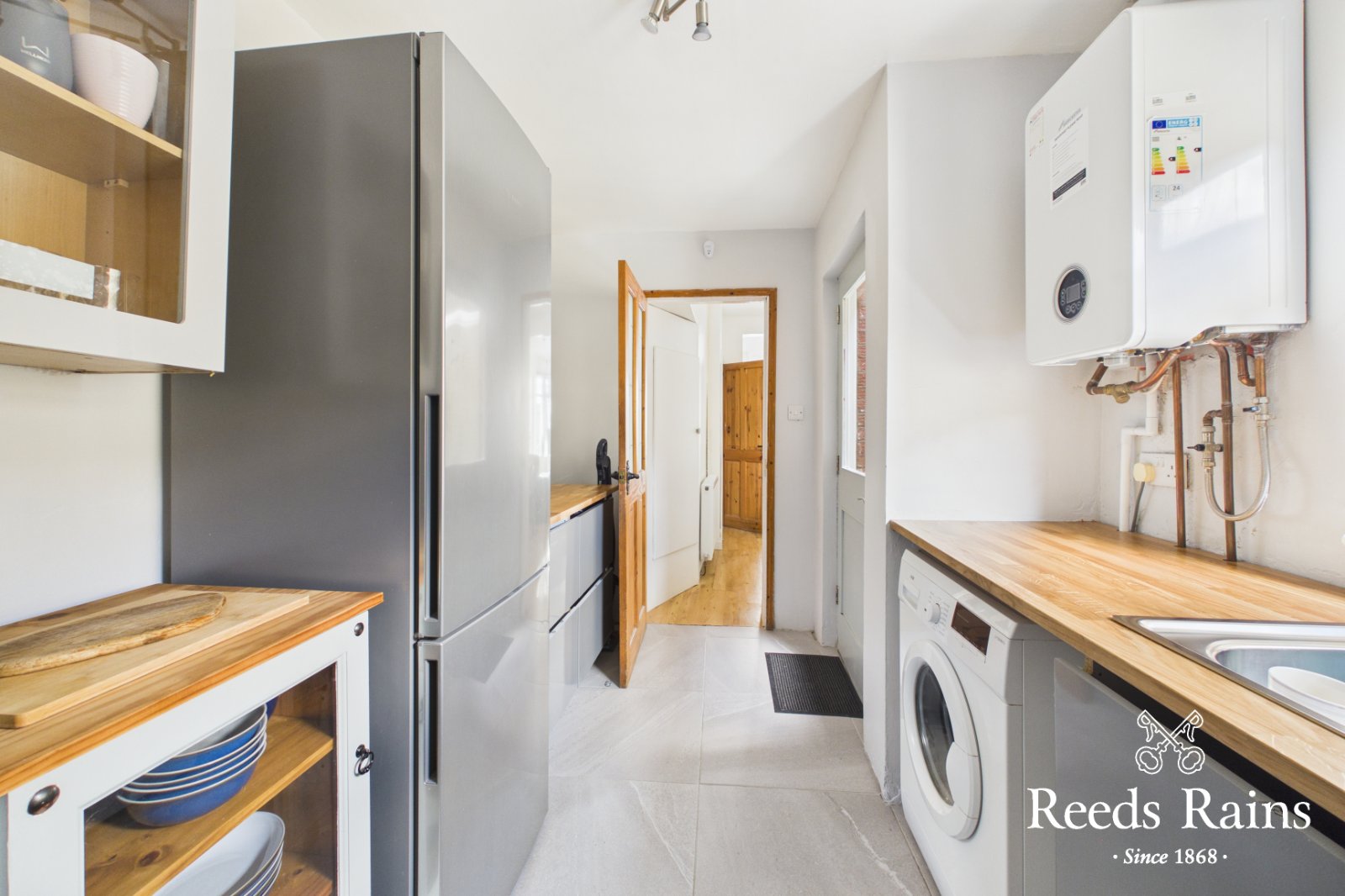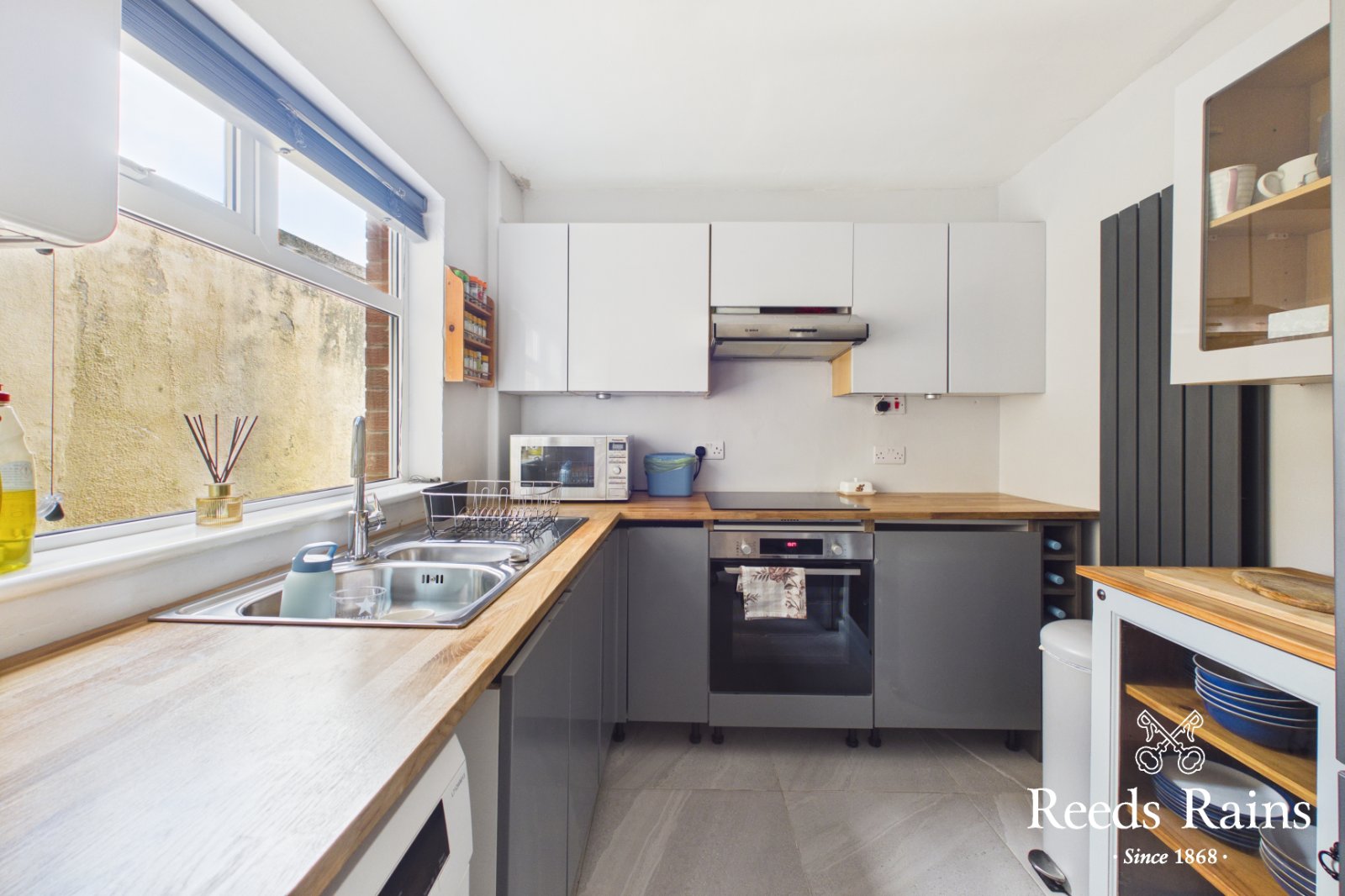 Modern new fitted kitchen with an excellent range of high and low level units, one and half Grohe drainer sink unit with Grohe stainless steel mixer taps, Bosch 4 ring induction hob with extractor fan, built in Bosch oven, space for fridge freezer, plumbed for washing machine. Solid Oak wooden work surfaces. Wall radiator. Glazed door to yard. New Worcester Bosch Gas boiler.