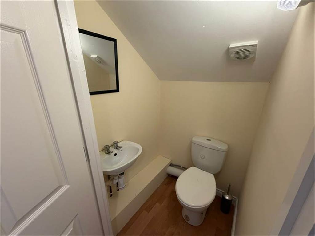 Cast Iron bath, telephone shower attachment, wash hand basin. Low flush WC and fully tiled walls.