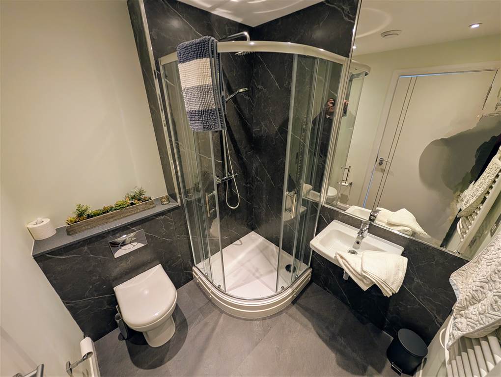 Ensuite comprising of corner shower, rain shower, wash hand basin, low flush wc.Granite work top. Mostly tiled and matching tiled floor.