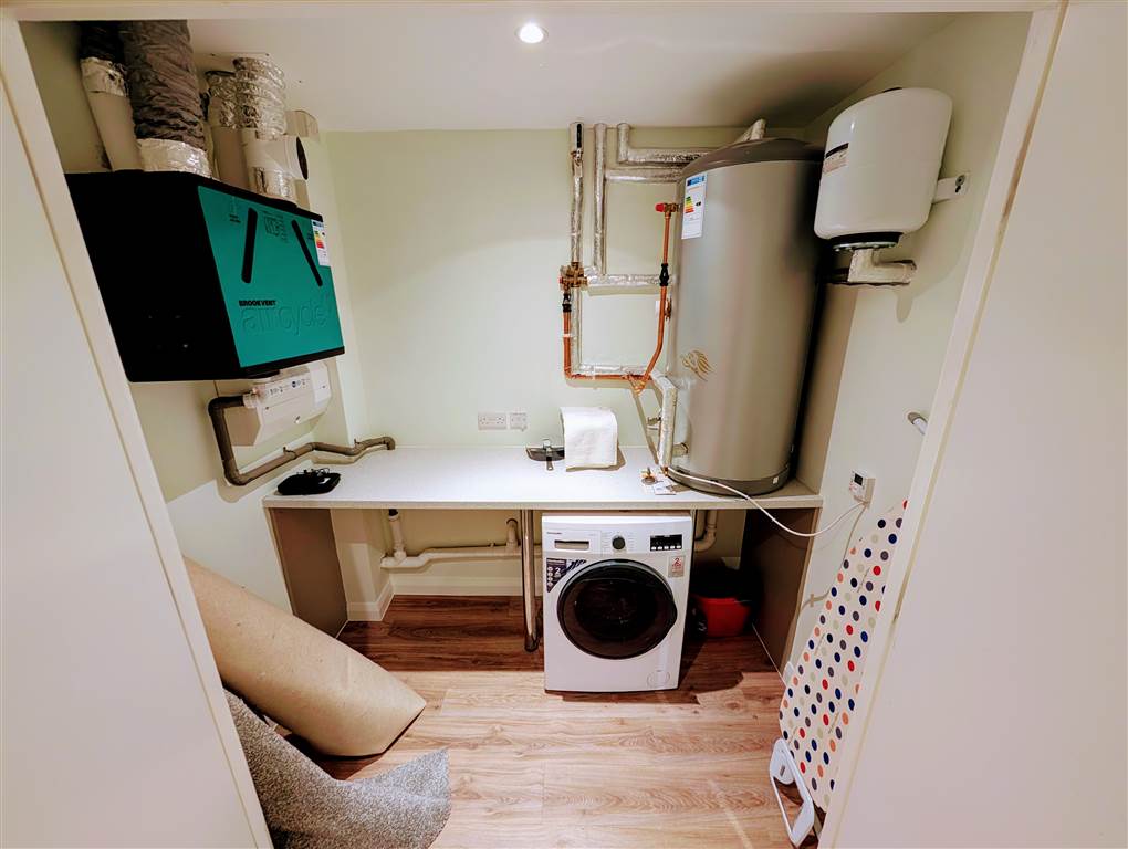 Large double store with washing machine and water cylinder.