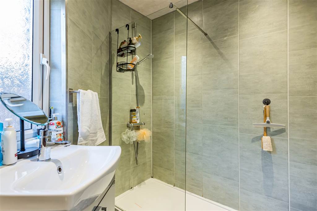 Three piece suite with double shower tray with glass panel and rain showerhead, low flush W/C and wash hand basin with vanity cabinet. Good natural lighting via frosted privacy glass and linoleum flooring.