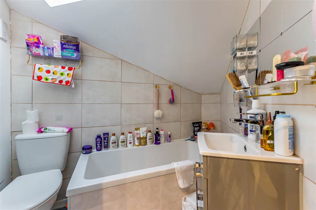 Three piece suite with panel bath, low flush W/C, and wash hand basin with vanity cabinet. Tiled walls and linoleum flooring.