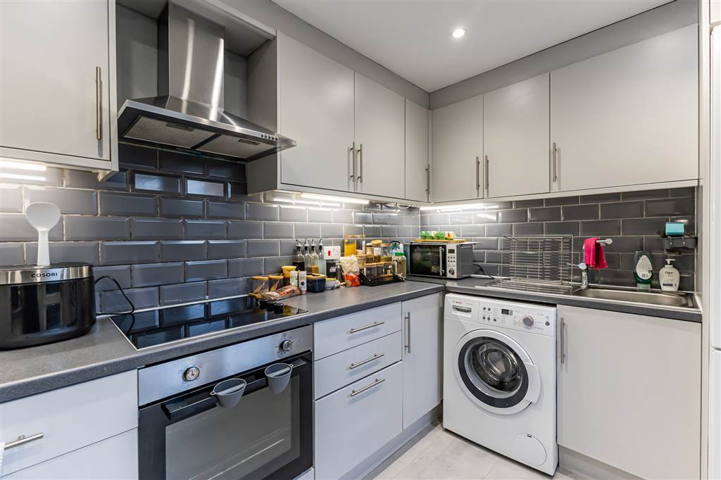 Range of high and low level units, stainless steel sink and drainer, laminate work-surfaces, halogen hob and integrated oven, stainless steel cooker hood, subway splashback tiling, recessed lighting and linoleum flooring.