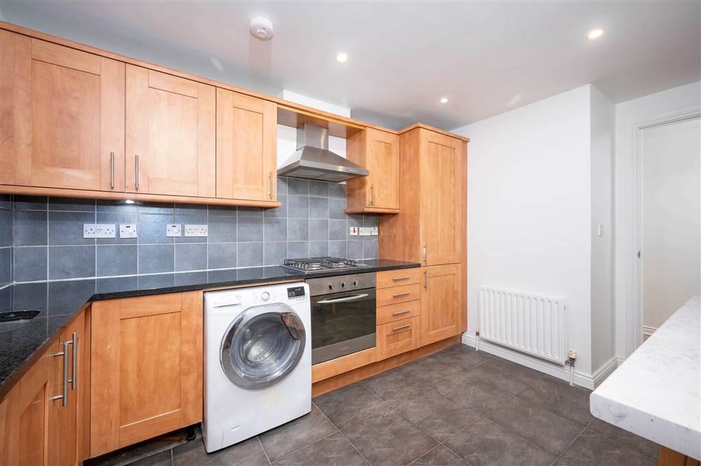 Range of high and low level units with granite work surface.Built-in oven and hob with matching cooker hood. Integrated fridge freezer, plumbed for washing machine, part tiled walls and tiled flooring. Recessed lighting.