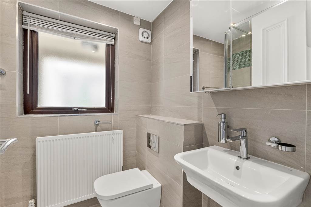 Fully tiled with three piece suite. Double shower tray, W/C and wash hand basin.