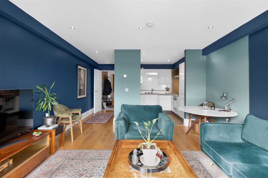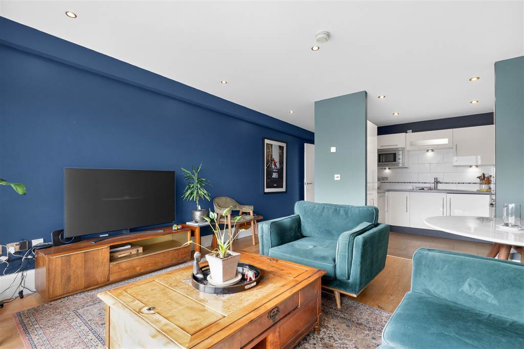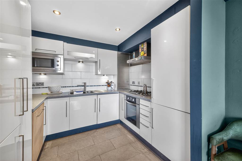 Recessed lighting and wooden flooring. Opening out to balcony. Open-plan to kitchen. Range of high and low level units, laminate work-surfaces, integrated fridge freezer, integrated washing machine, four ring gas hob with extractor fan. Tiled flooring and recessed lighting.
