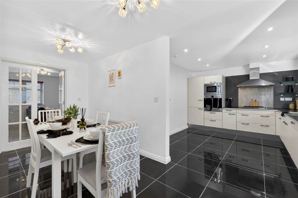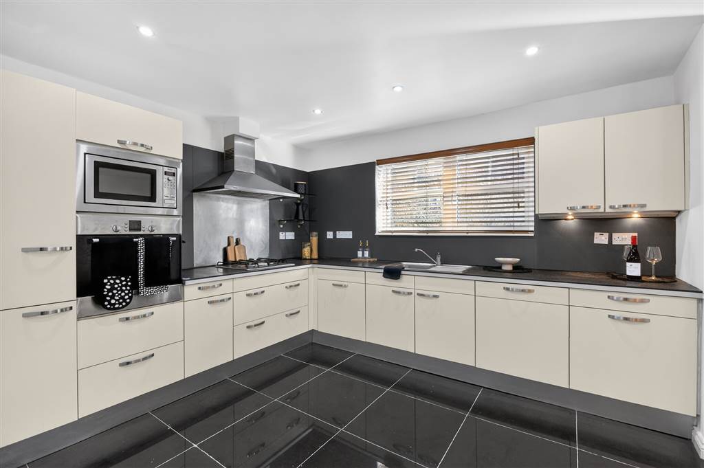 Range of high and low level units, single drainer stainless steel sink unit. Integrated gas hob, eye level microwave and oven, stainless steel extractor hood, integrated dishwasher and fridge freezer, tiled floor, recessed spot lighting, granite work surfaces and feature splashback.