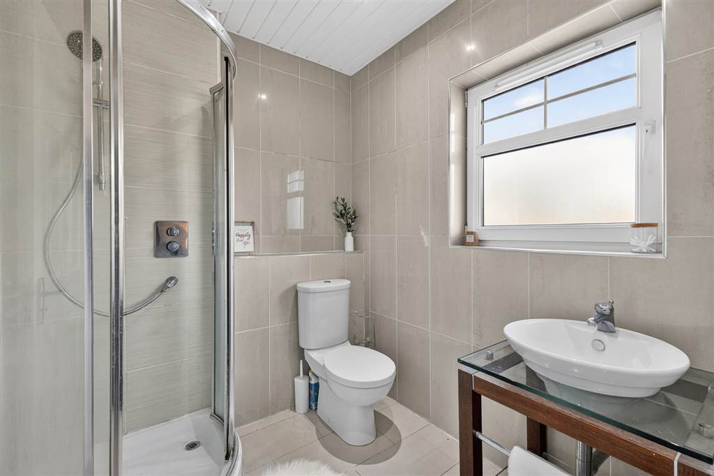 Shower cubicle, low flush WC, feature bowl and pedestal, tiled floor and tiled walls. Recessed lighting and extracter fan.