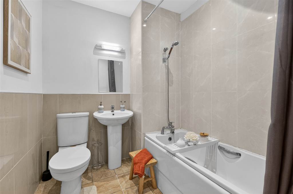 White suite, panelled bath, low flush WC, pedestal wash hand basin, shower attachment over bath, recessed lighting, extractor fan, part tiled walls and tiled floor.