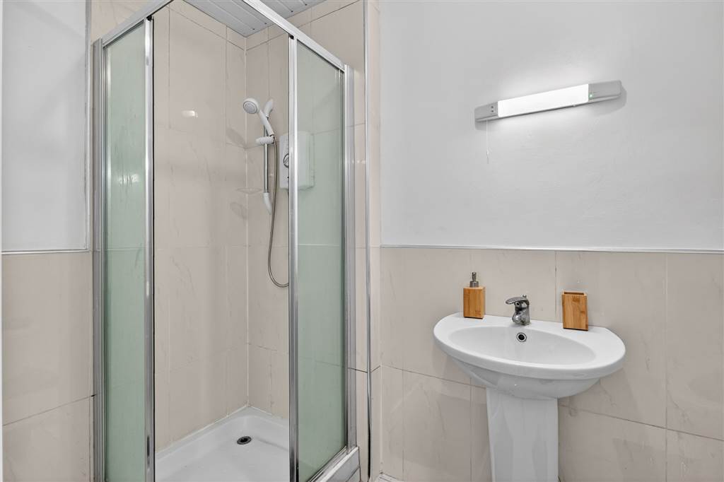 Shower cubicle, glass shower, pedestal wash hand basin, low flush WC, extractor fan, part tiled walls and tiled floor.