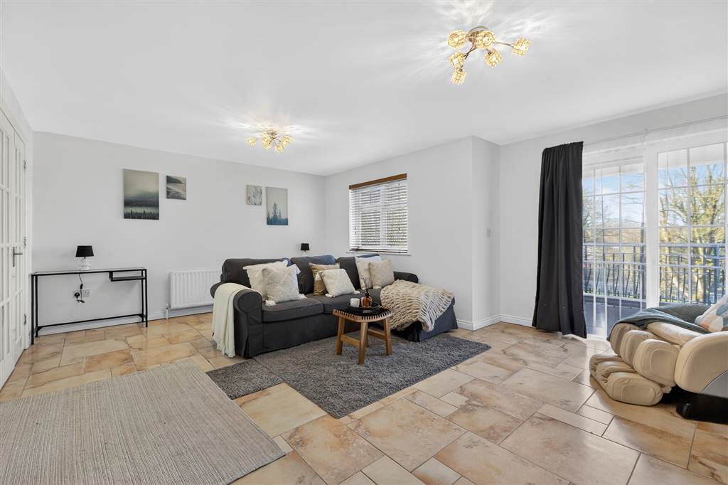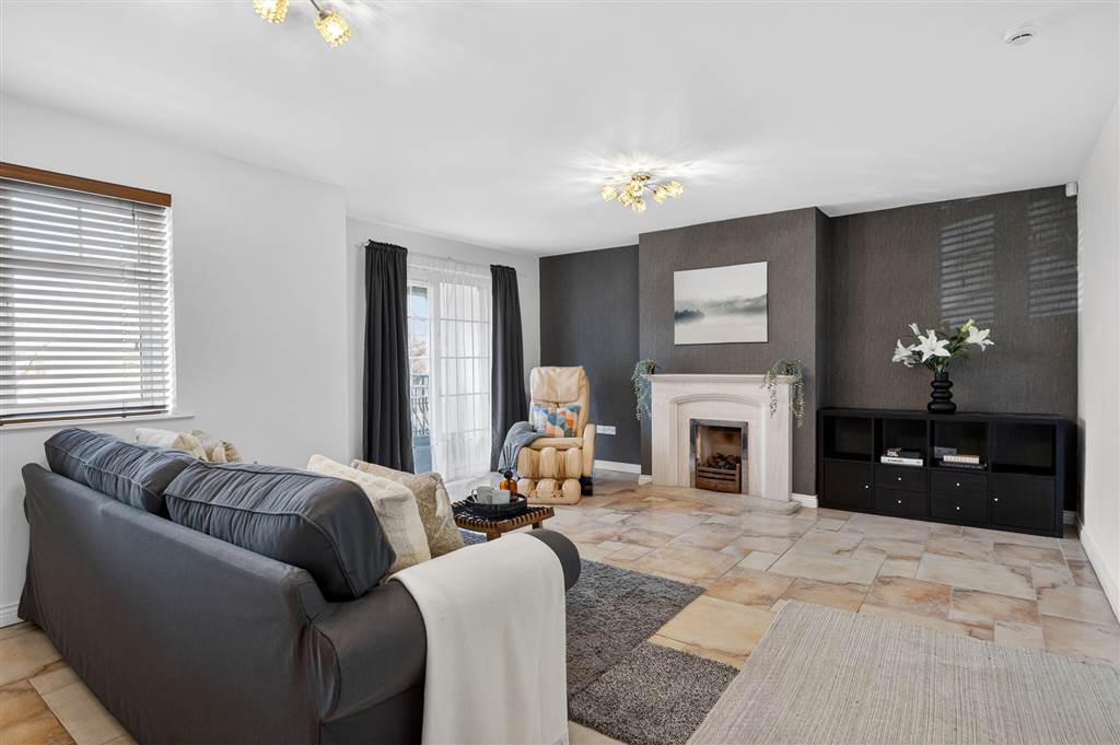 Tiled floor, patio doors to balcony, sandstone fireplace, gas fire inset and sandstone hearth. Double glass panelled doors to dining area.