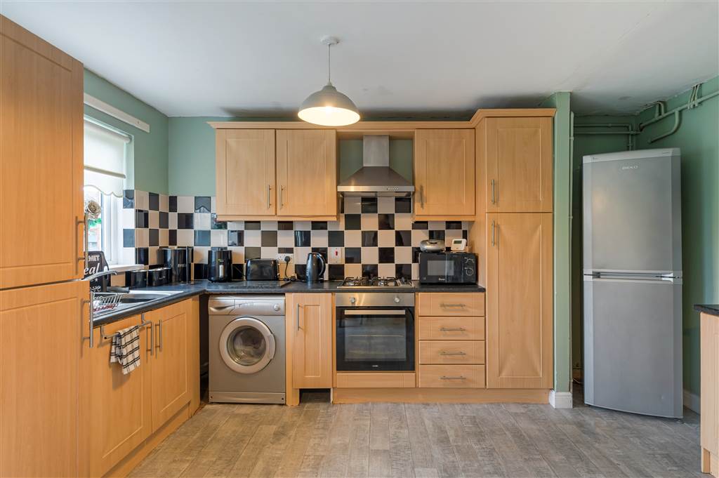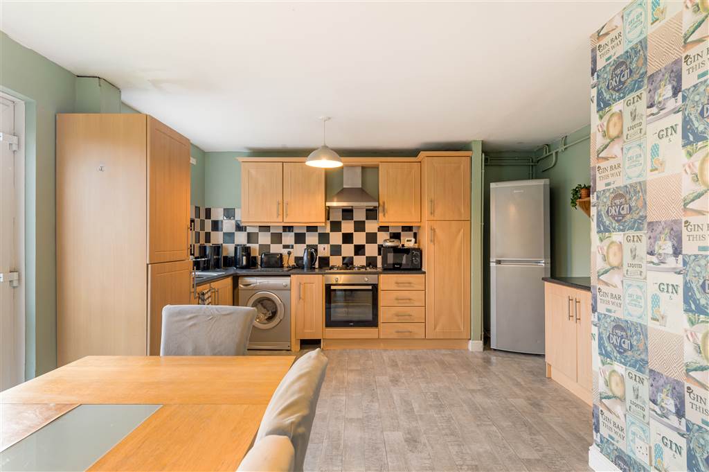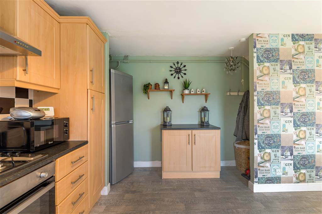 Excellent range of high and low level units, Formica work surfaces, stainless steel sink unit with mixer taps, 4 ring ceramic hob and electric oven, stainless steel extractor fan, plumbed for washing machine, fridge freezer space, under stair storage.