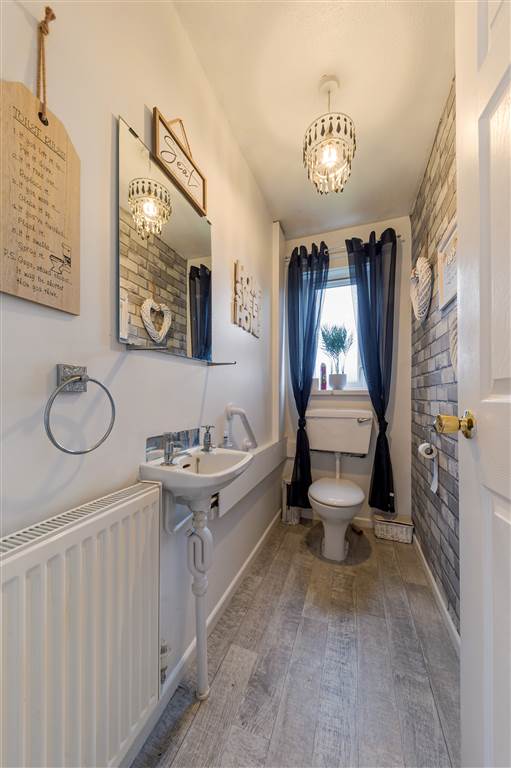 White suite comprising of low flush w.c, wash hand basin with mixer taps, panelled radiator.