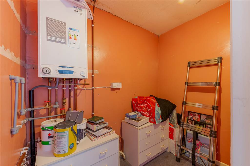 Storage cupboard, gas fired central heating boiler. Access to roofspace.