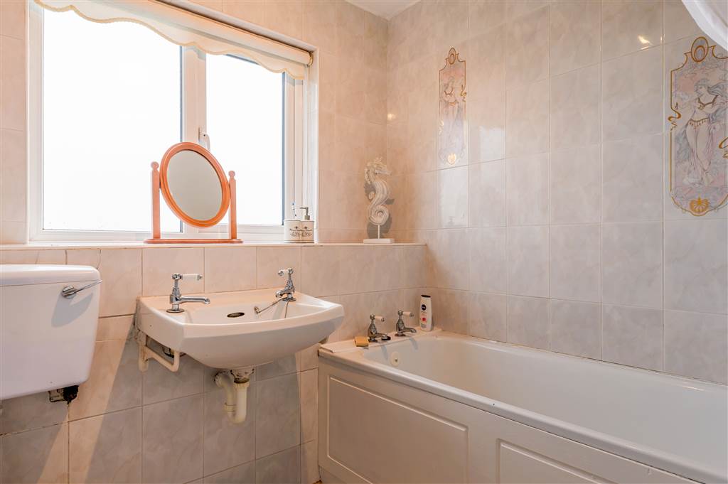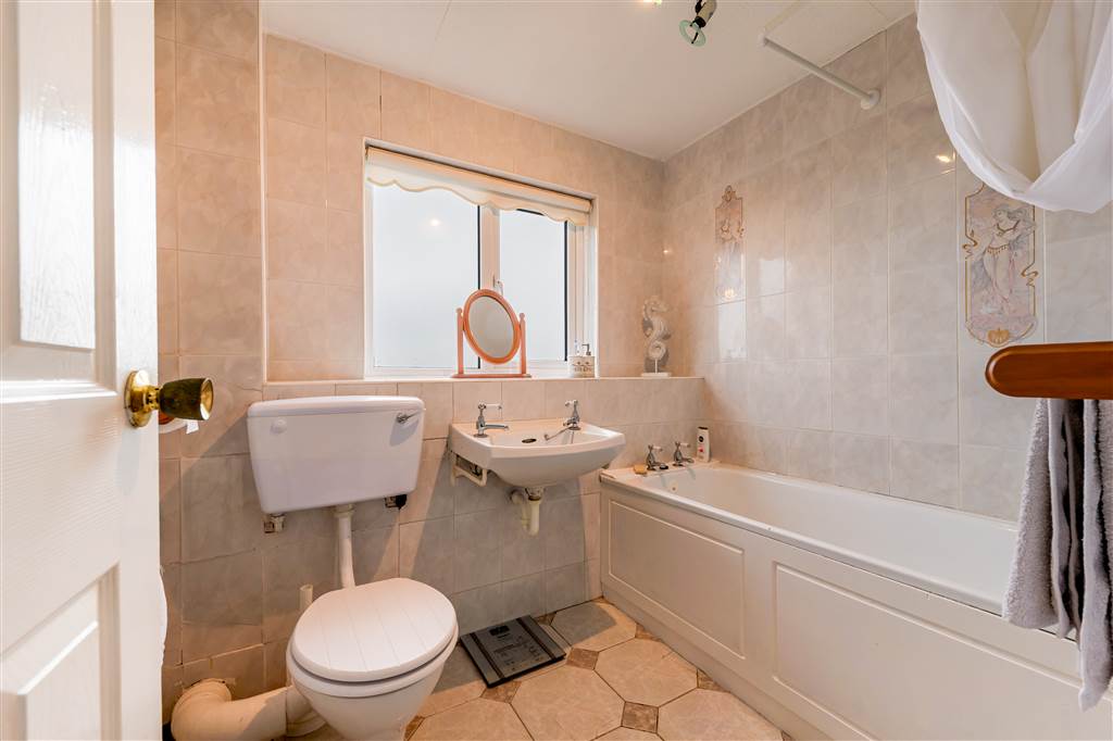 White suite comprising of panelled bath, low flush W.C, wash hand basin, fully tiled walls, ceramic tiled flooring, panelled radiator.