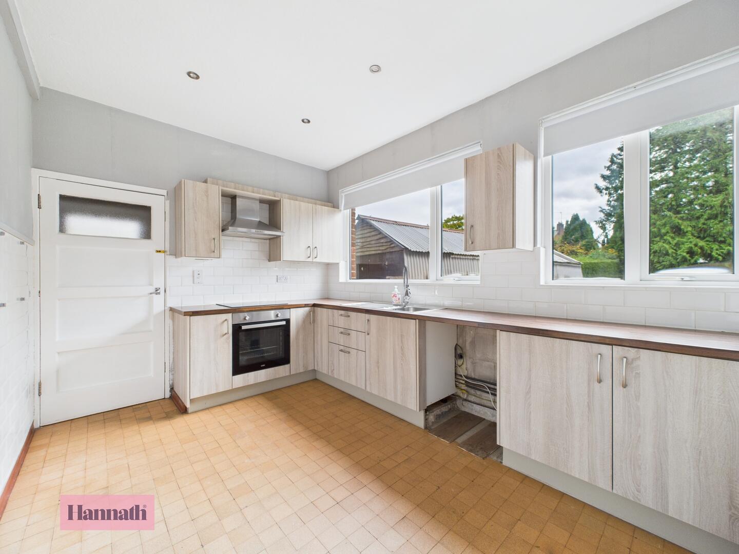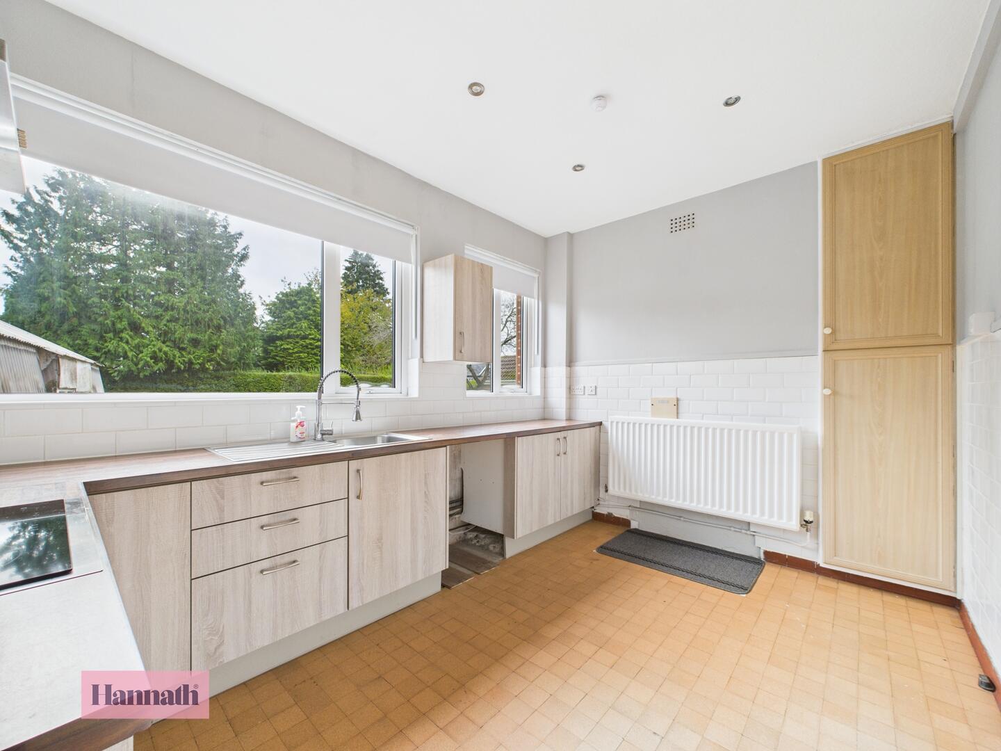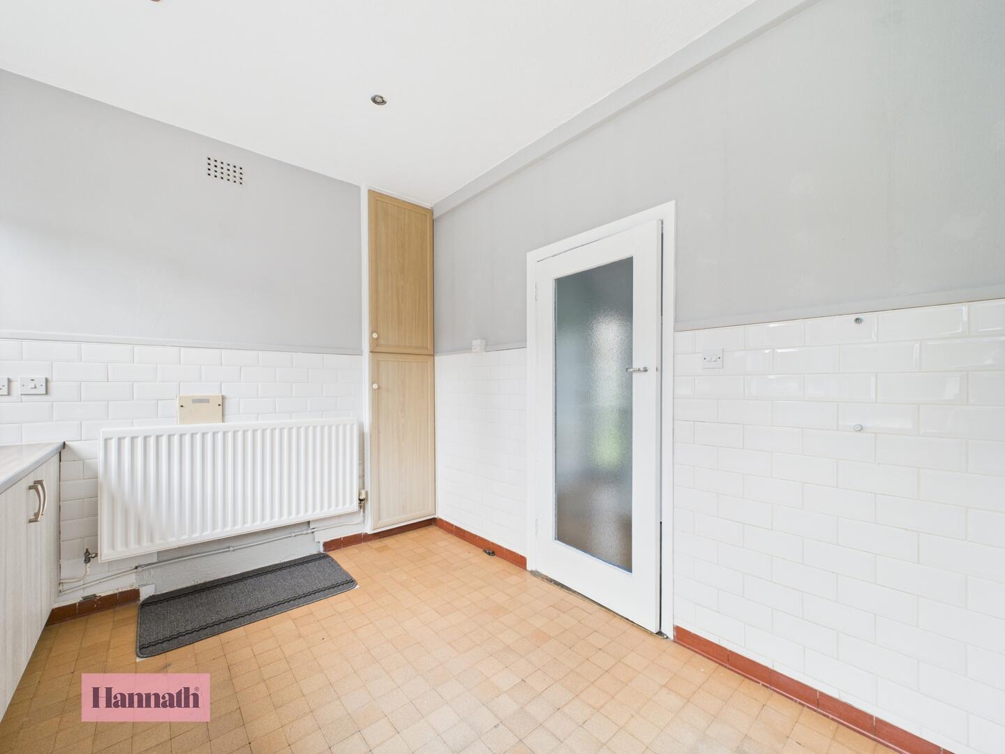 Range of modern integrated units, oven unit, space for fridge freezer and dishwasher, tiled flooring, radiator, part tiled walls